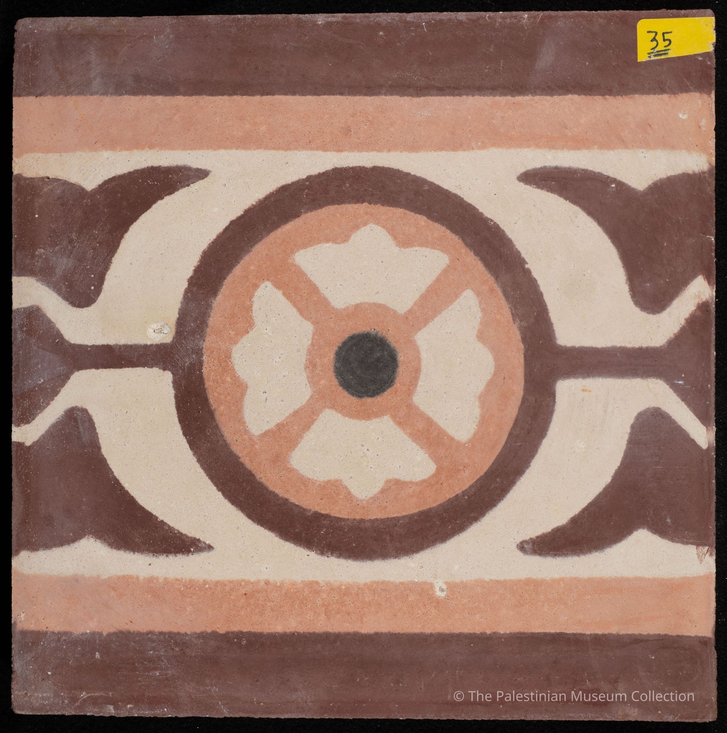 بلاطة زنار إسمنتيّة ملوّنة بحجم 20 × 20 سم. وهي نموذج حديث سُكبت في قالب يمتلكه مصنع أصلان للبلاط في نابلس.