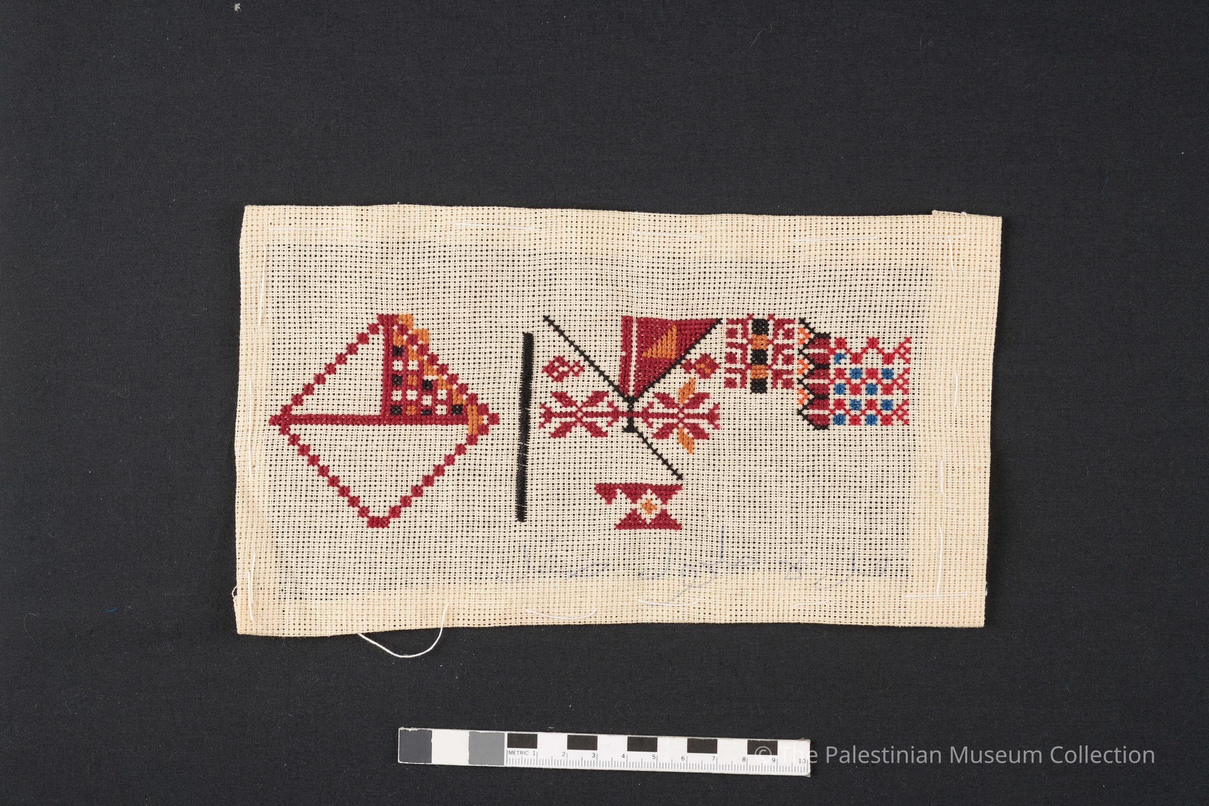نموذج تطريز على قماش ايتامين بحرير لون احمر واصفر واسود وازرق عليها رسمات متعددة منها الريش
