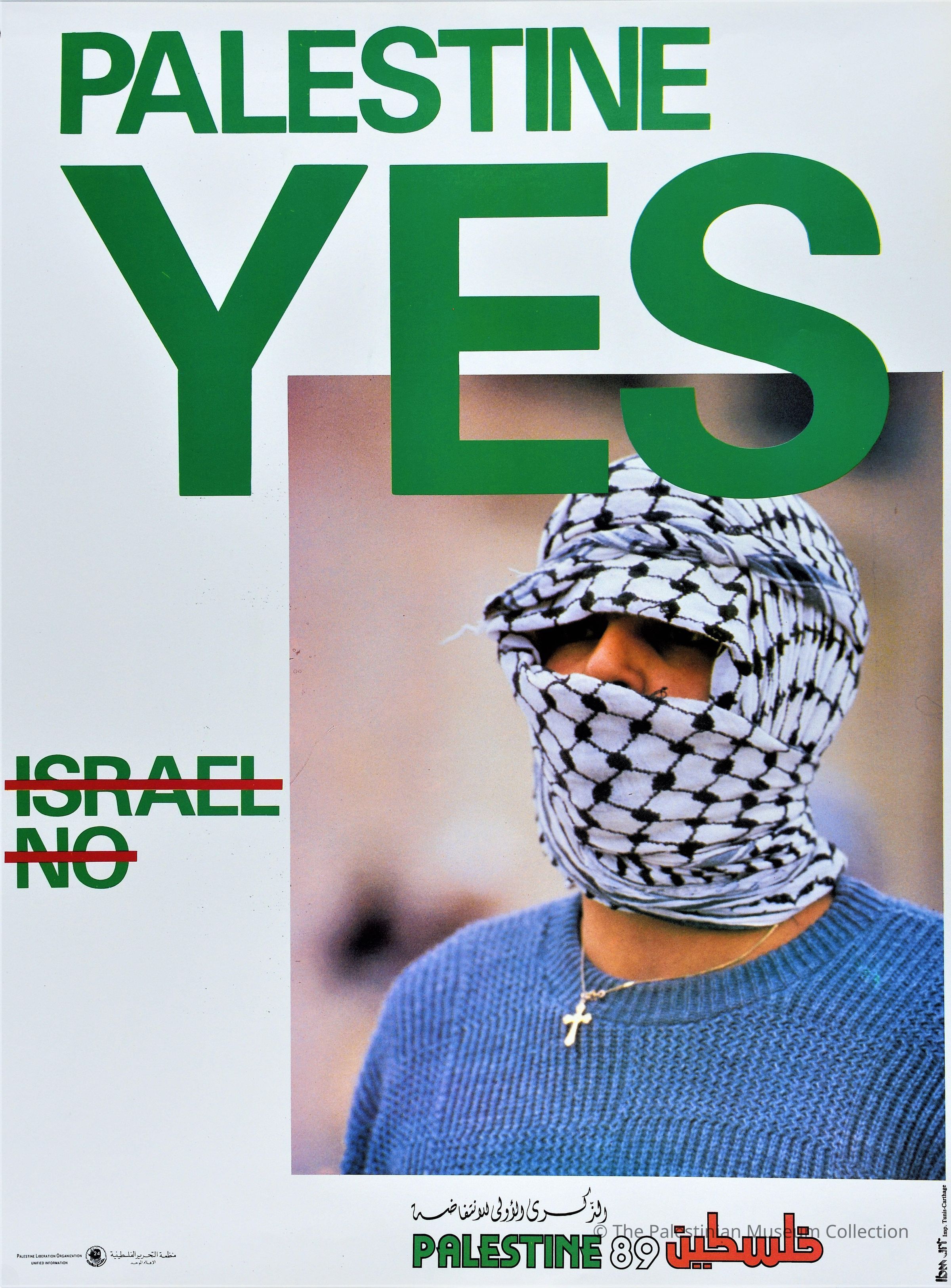 ملصق ملون، يظهر فيه شاب ملثم بالكوفية الفلسطينية، يرتدي الصليب حول عنقه، كتب عليه باللغة الإنجليزية " فلسطين نعم، اسرائيل لا".