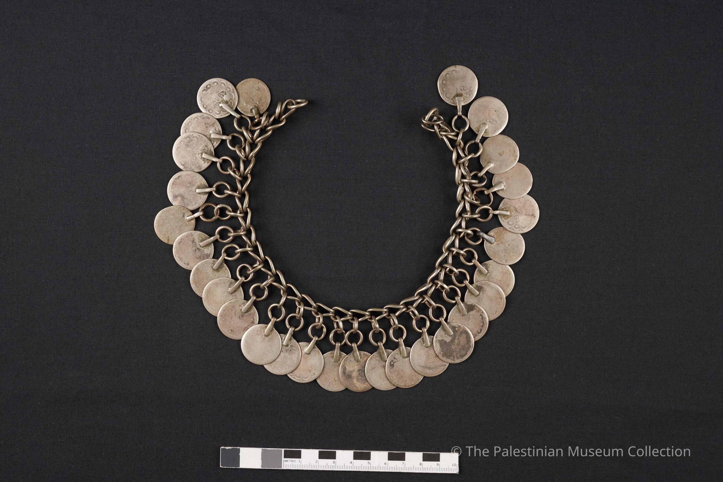 A traditional silver necklace adorned with Ottoman and Austrian coins and worn in several regions throughout PalestineMade/Created