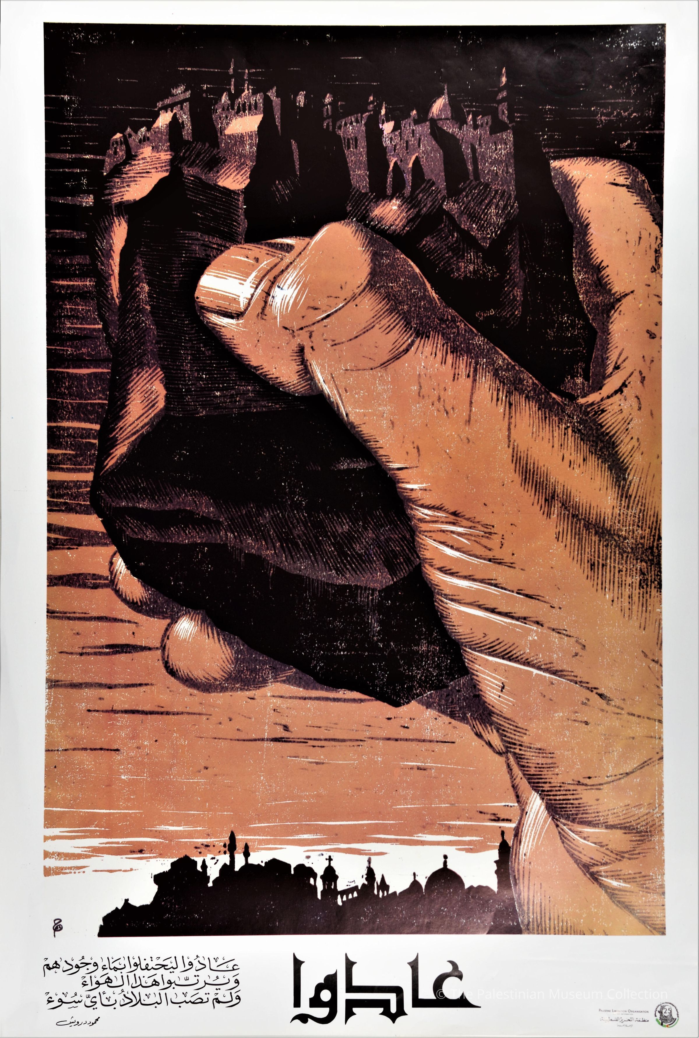 ملصق ملون، عبارة عن يد تقبض على مدينة كما حجرٍ. أُرفد الملصق بعبارة "عادوا" متبعاً بأبيات من قصيدة محمود درويش "مأساة النرجس ملهاة الفضة".
