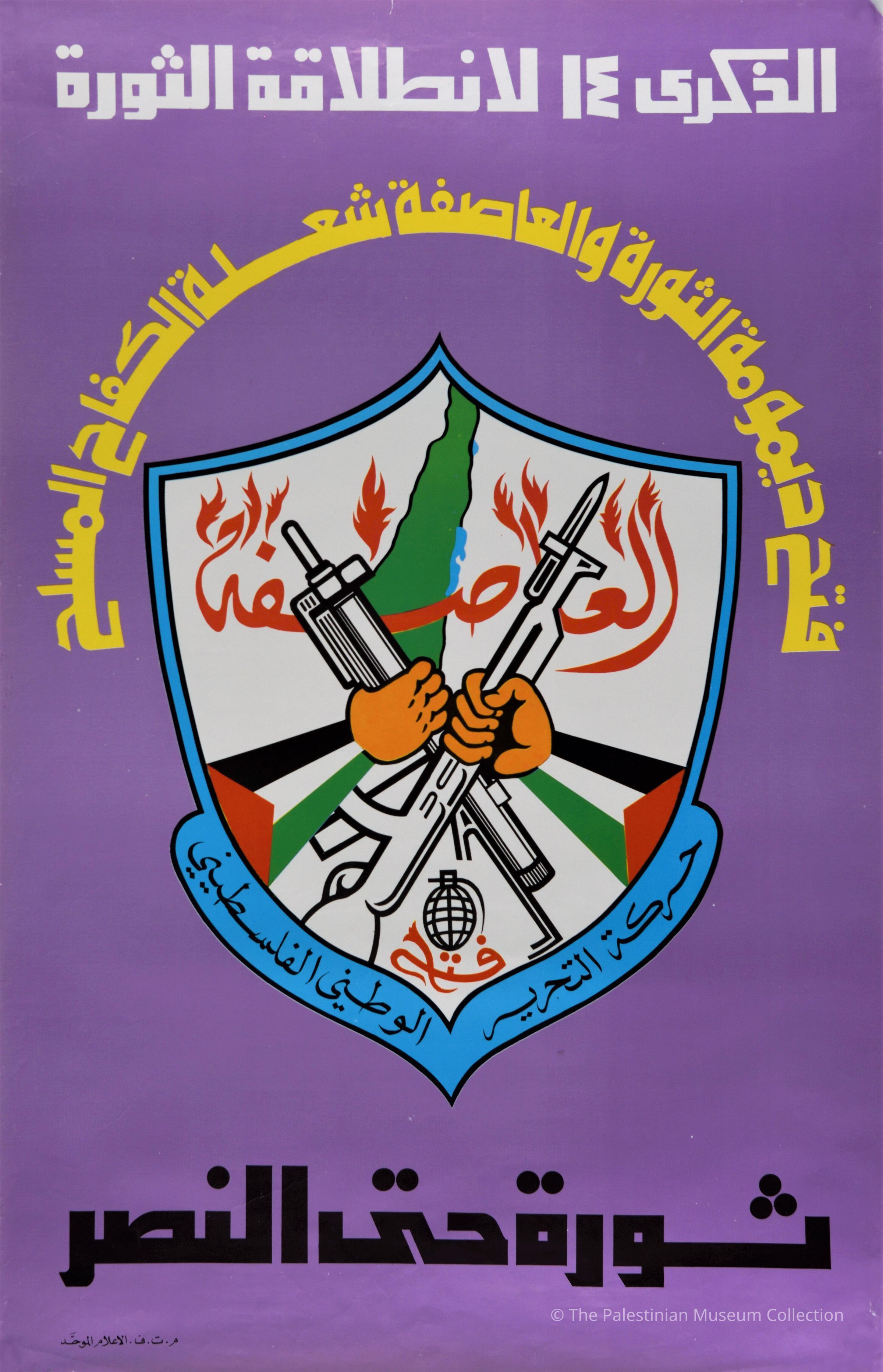 Published on the 14th anniversary of the Revolution, this colour poster shows the PLO logo; which shows the Palestinian flag, a rifle and the map of Palestine.Dimensions