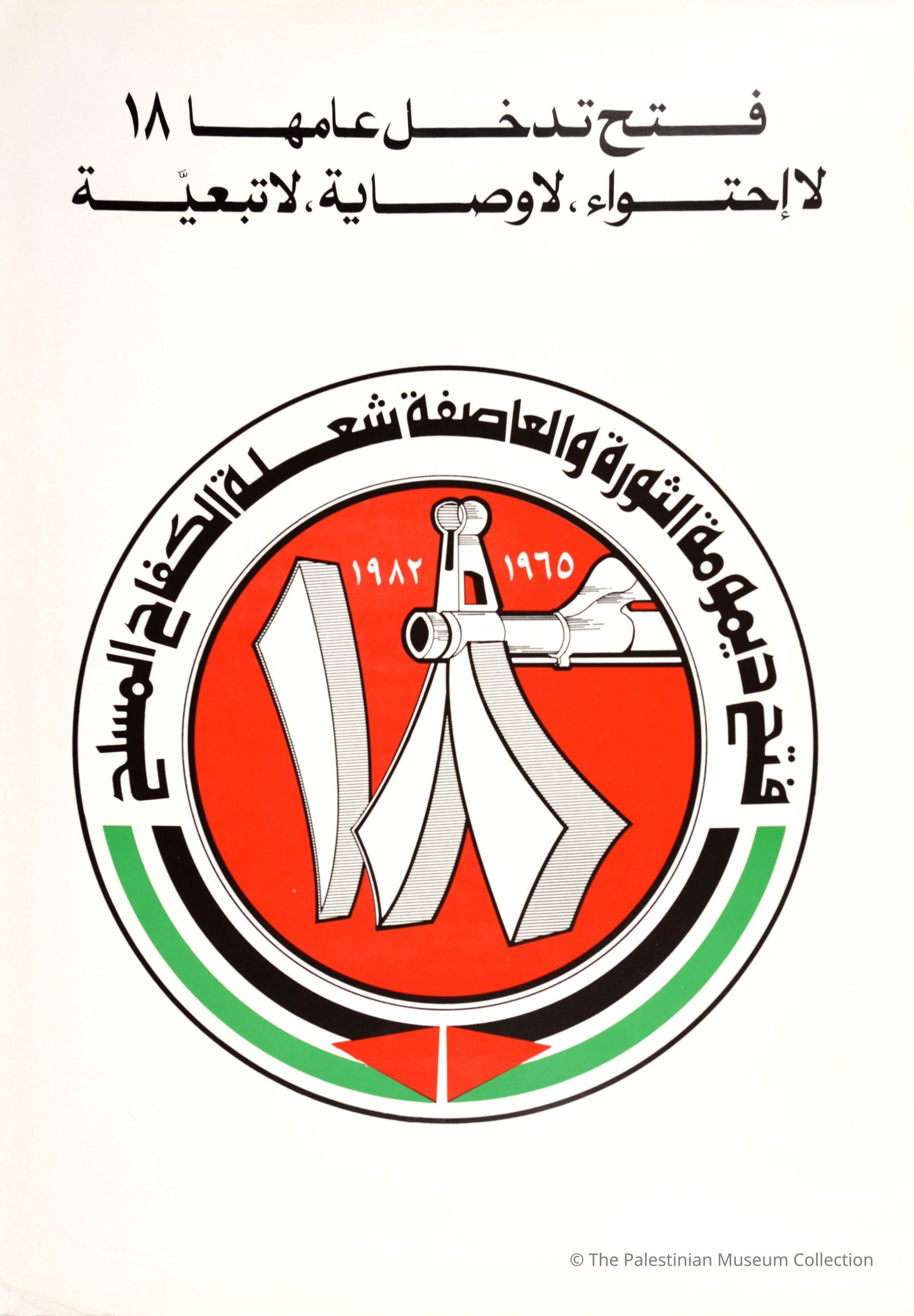 This poster entitled '18 Years of Fatah: No Containment, No Trusteeship, No Subservience' was issued in 1982 by the Palestinian National Liberation Movement-Fatah in commemoration of the 18th anniversary of its formation.Dimensions
