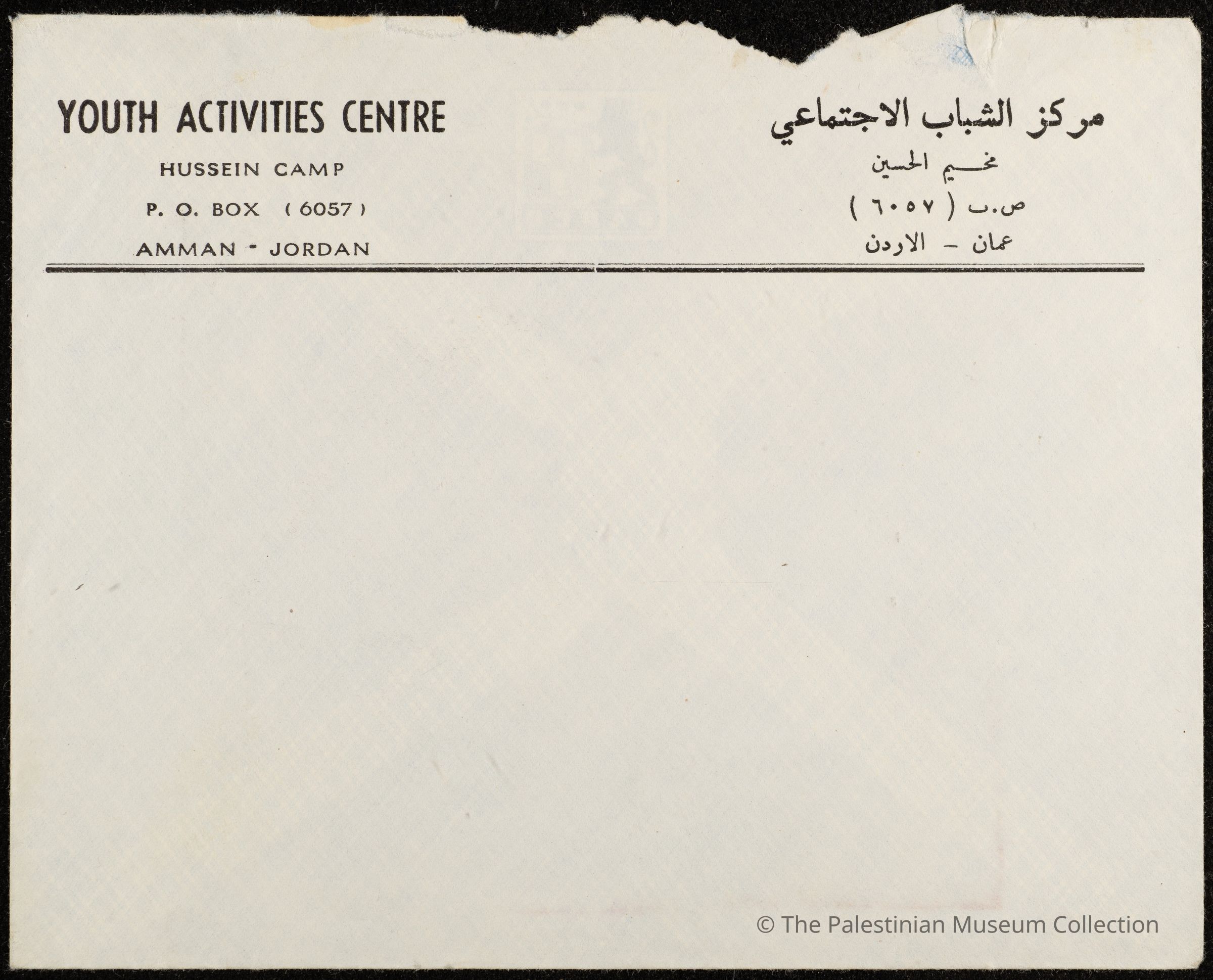 دعوة مُقدمة من مركز الشباب الاجتماعي في مخيم الحسين إلى السيد علي فودة بتاريخ 25\3\1974م لحضور أمسية شعرية في قاعة المركز.