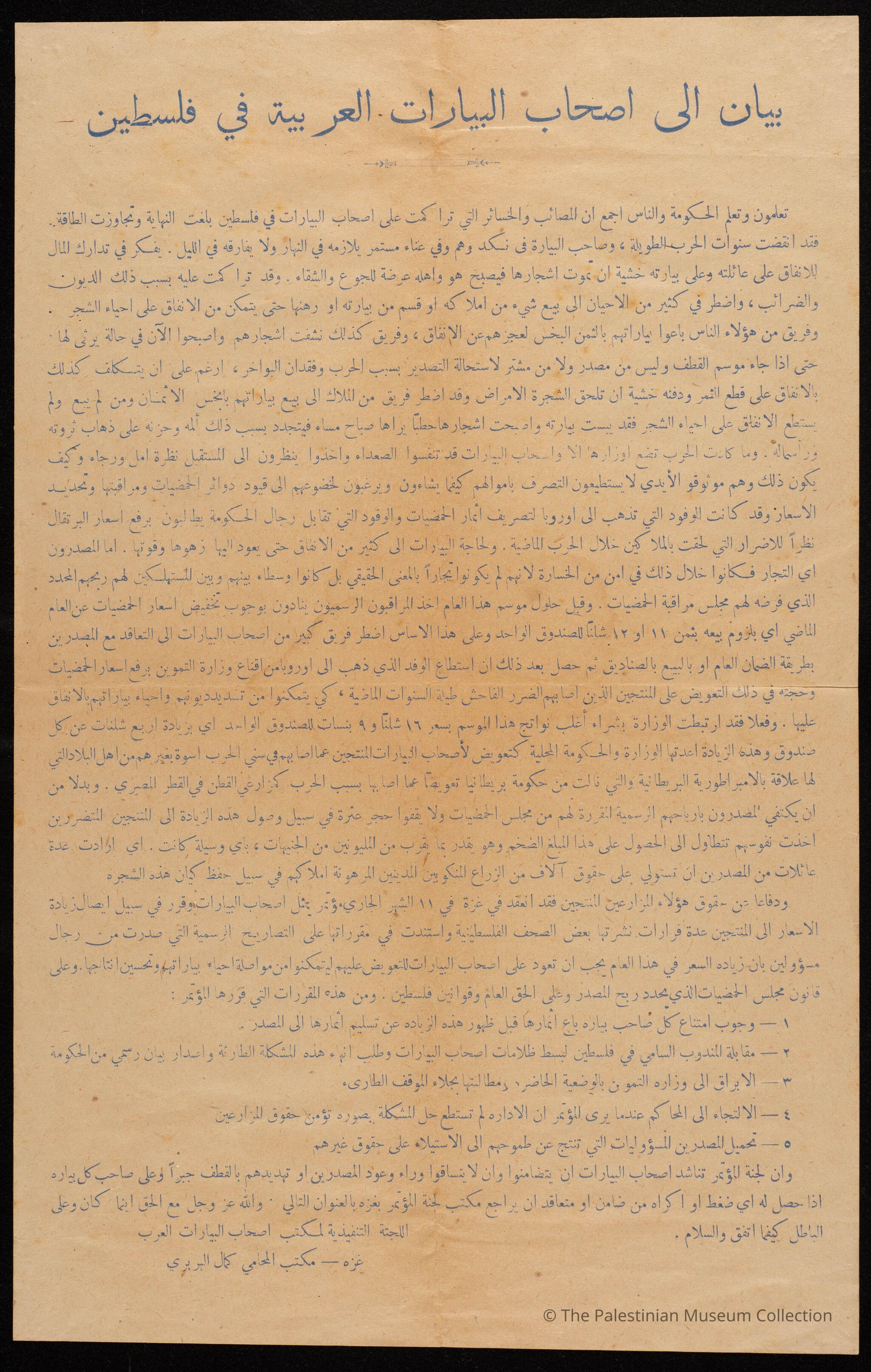 بيان إلى أصحاب البيارات العربية في فلسطينEntry/Object ID