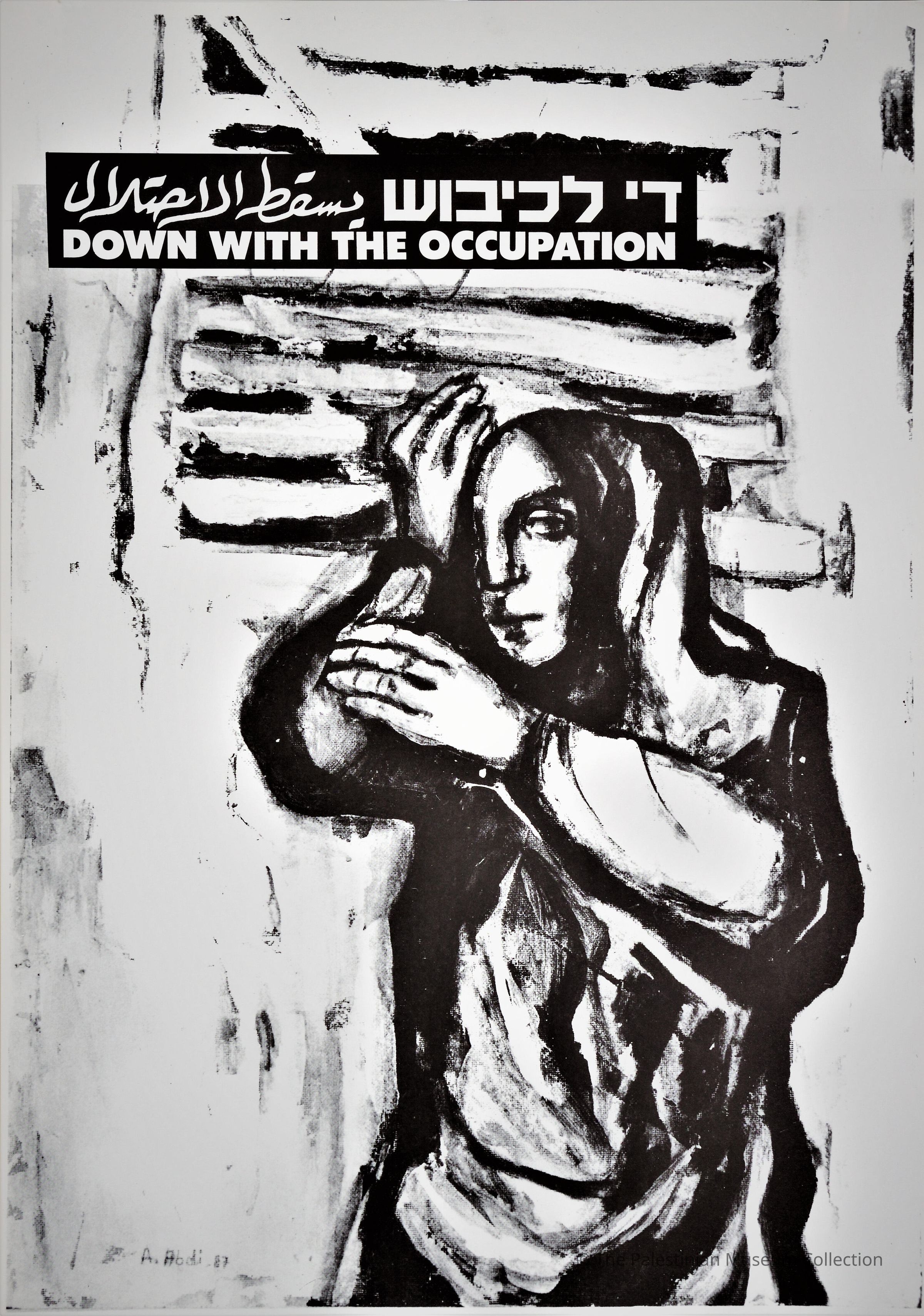 This poster by the artist Abed Abdi was part of the 'Down with the Occupation' exhibition held in 1987 by the Association of Artists for Freedom of Expression in the El-Hakawati Theatre in Jerusalem to mark 20 years since the 1967 occupation of the West Bank. The exhibition included posters by Palestinian and Israeli artists.Dimensions