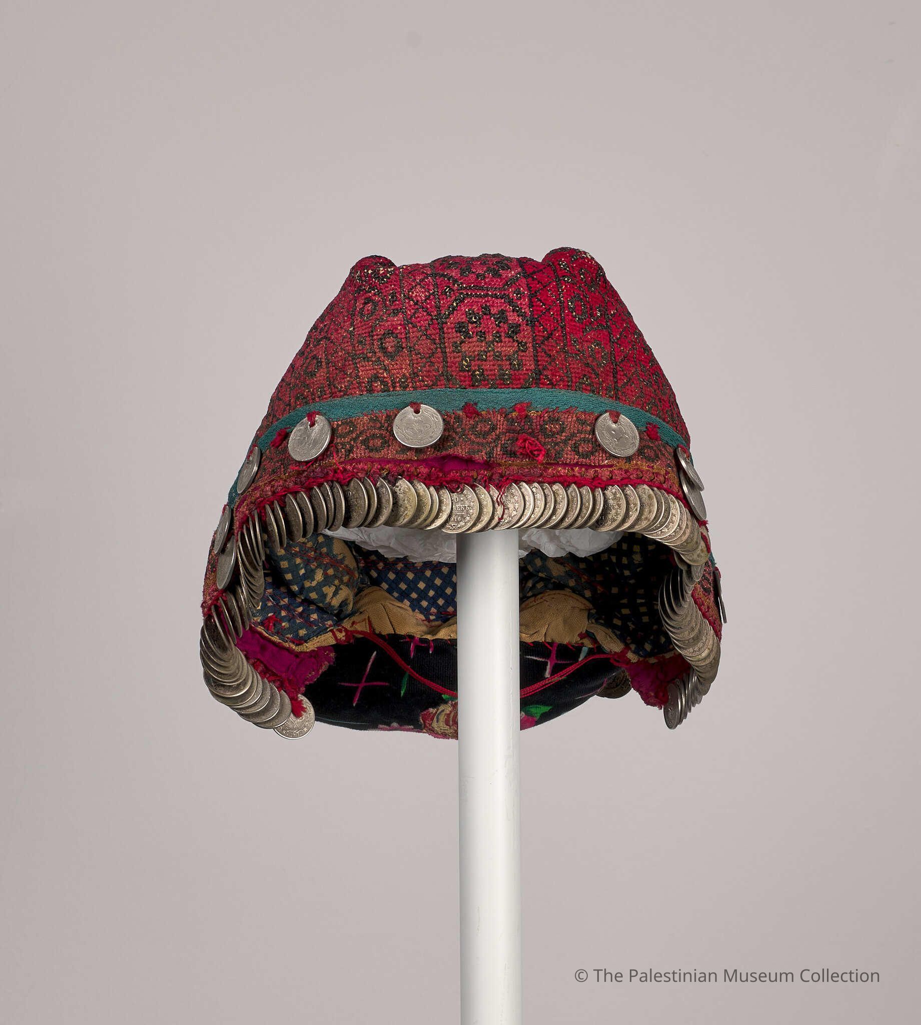 صفة (طاقيّة) من منطقة رام الله، مصنوعة من القطن، ومُطرّزة بشكل كامل بخيوط من الحرير الأحمر المتداخل مع ألوان أخرى، أُضيفت عليها من الجهة الخلفيّة قطعة قماش من القطن والكتان تدلّت منها قطع من العملة العثمانيّة كبيرة الحجم، كما تحمل قطعة من قماش قطن أزرق يحمل رسمة الورود، وفي مقدمة الصفّة صفّ من العملات العثمانية الأصلية متوسط الحجم، وهي مبطنة من الداخل بقماش قطني مخطط باللون الأزرق والبيج. كانت الصفّة جزءًا من مهر العروس، ترتديها يوم عرسها وفي الأيّام اللّاحقة لحفلة الزفاف بصورة مستمرّة.Made/Created