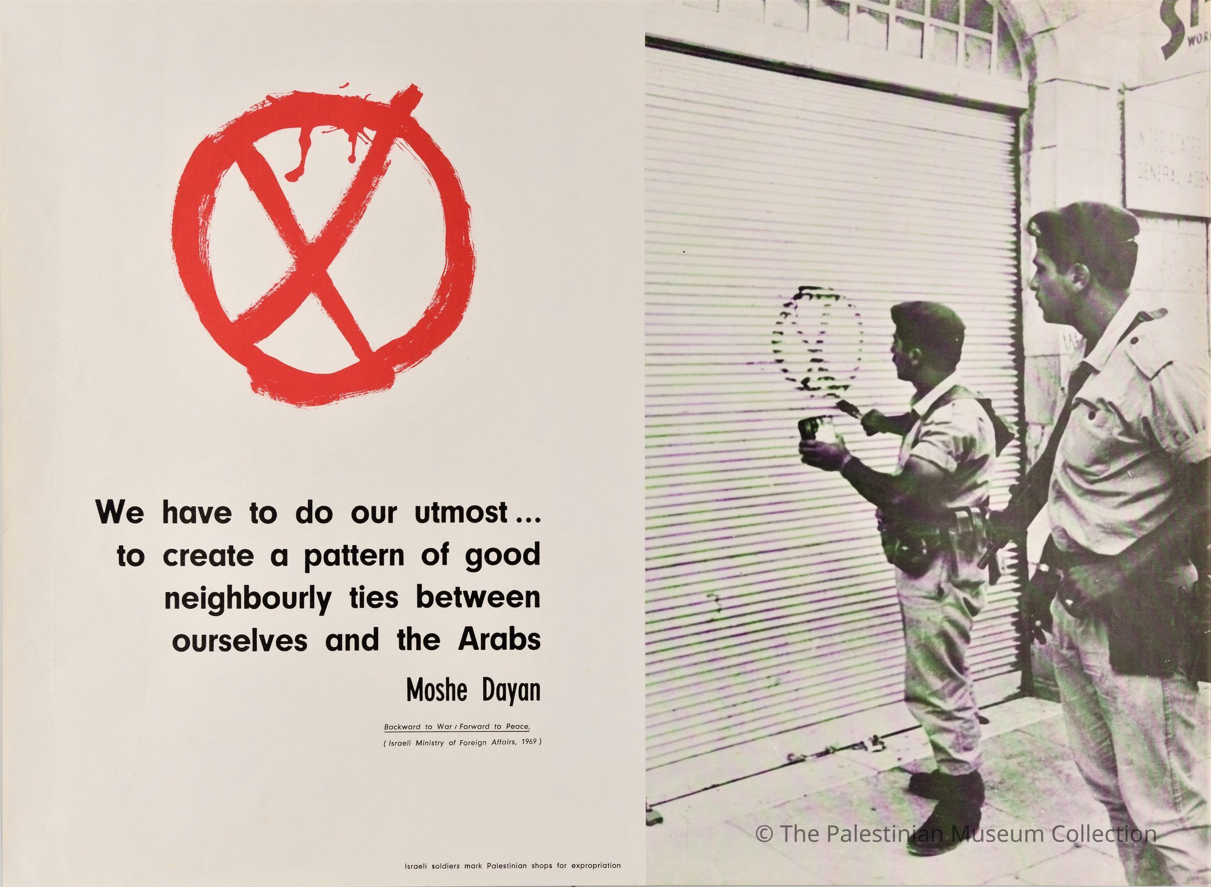 A colour poster showing Israeli Occupation soldiers painting signs; with spray paint, on the stores of Arabs; to be confiscated by the Israeli Occupation.Dimensions