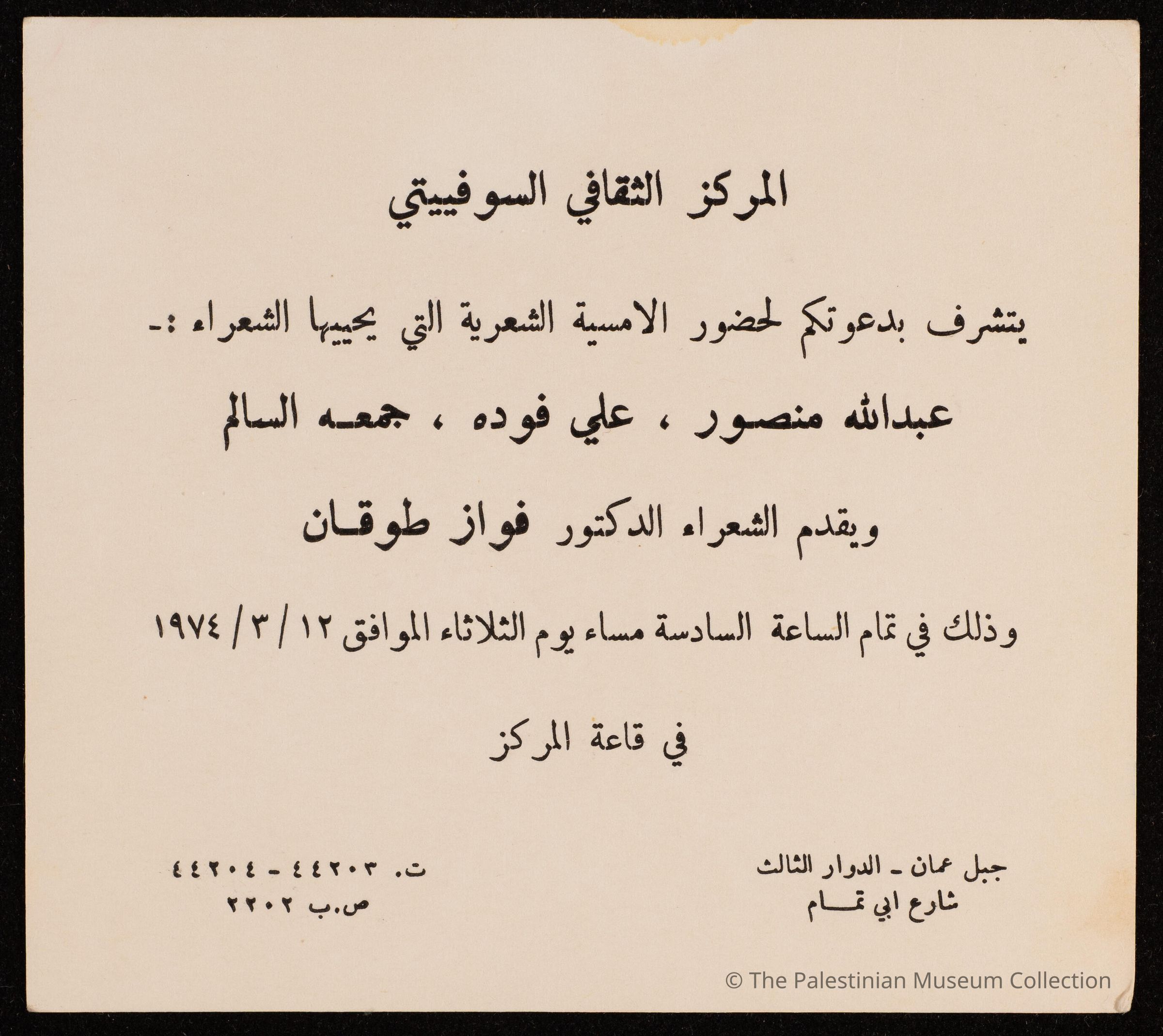 دعوة من المركز الثقافي السوفييتي، يحتوي على دعوة لحضور امسية شعرية يحييها الشعراء عبدالله منصور، علي فودة، جمعة السالم في قاعة المركز