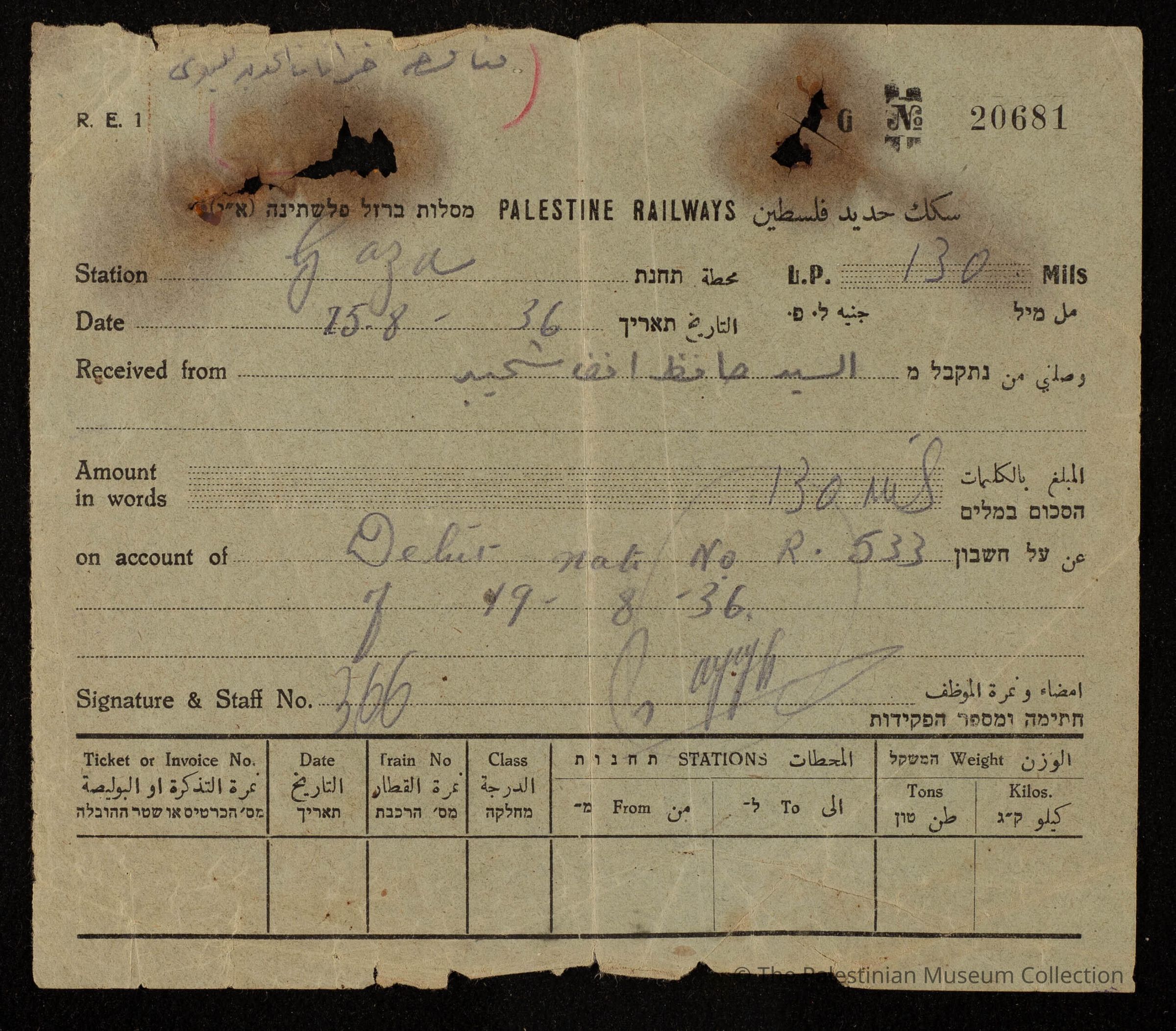 وصل دفع صادر عن محطة سكة حديد غزةEntry/Object ID