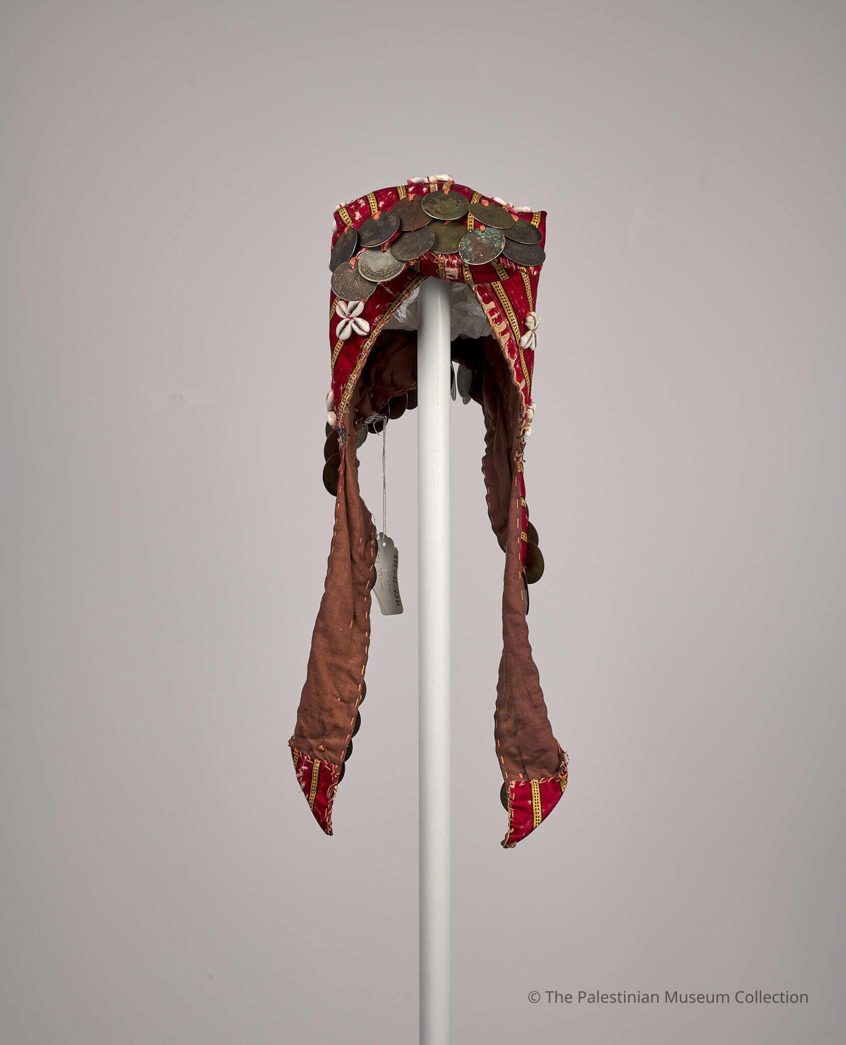 وقاة بدو من منطقة دير البلح، مصنوعة من قماش الأطلس، مُزيّنة وجانبيها بالعملات الفضية العثمانية والودع الذي اُستخدم كعملة للمقايضة أحياناً.Made/Created