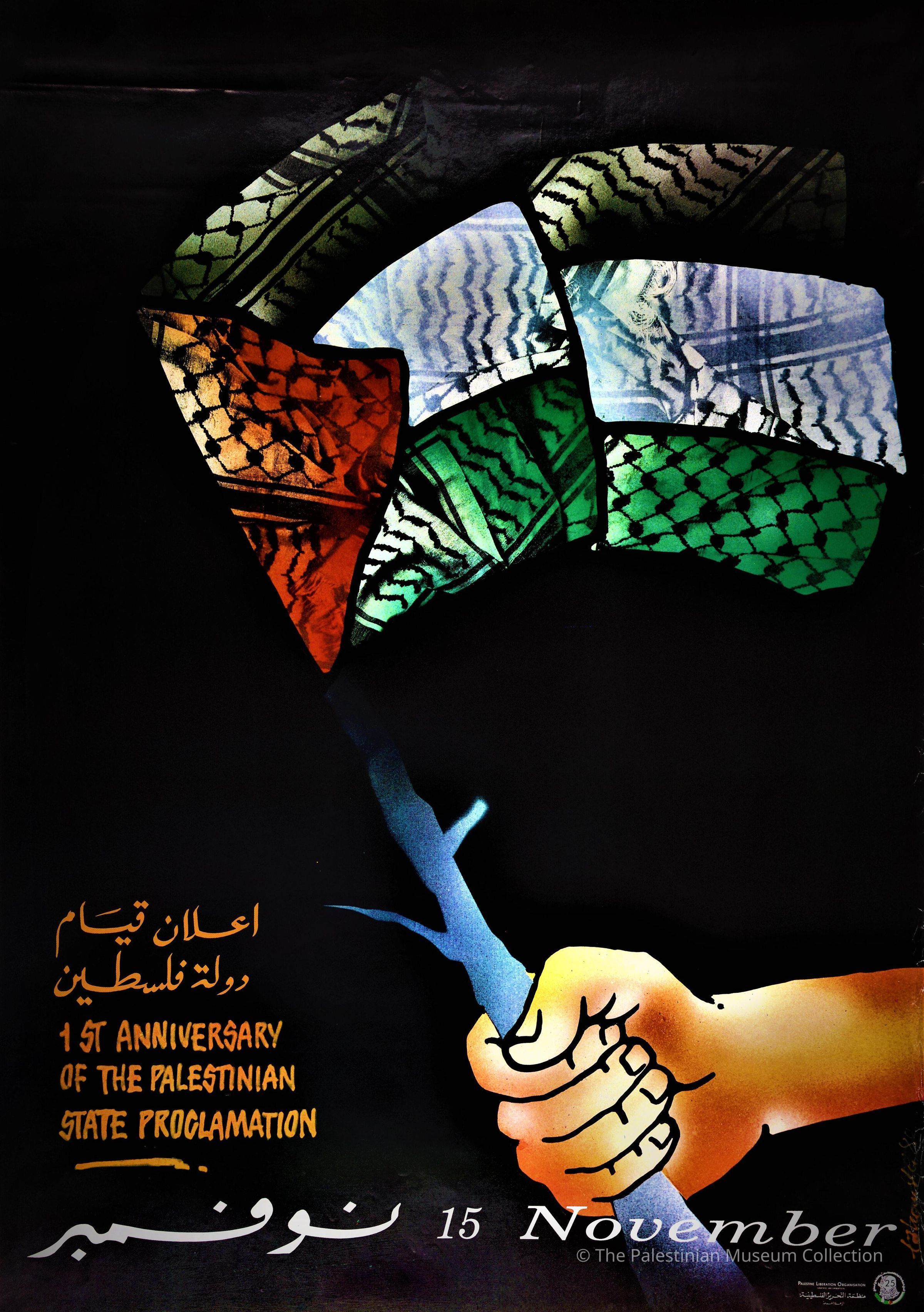 ملصق ملون عبارة عن رسمة ليد تحمل غصناً عليه علم فلسطين، نشر بمناسبة الذكرى الأولى لإعلان دولة فلسطين. (يوجد ملصق آخر منه)