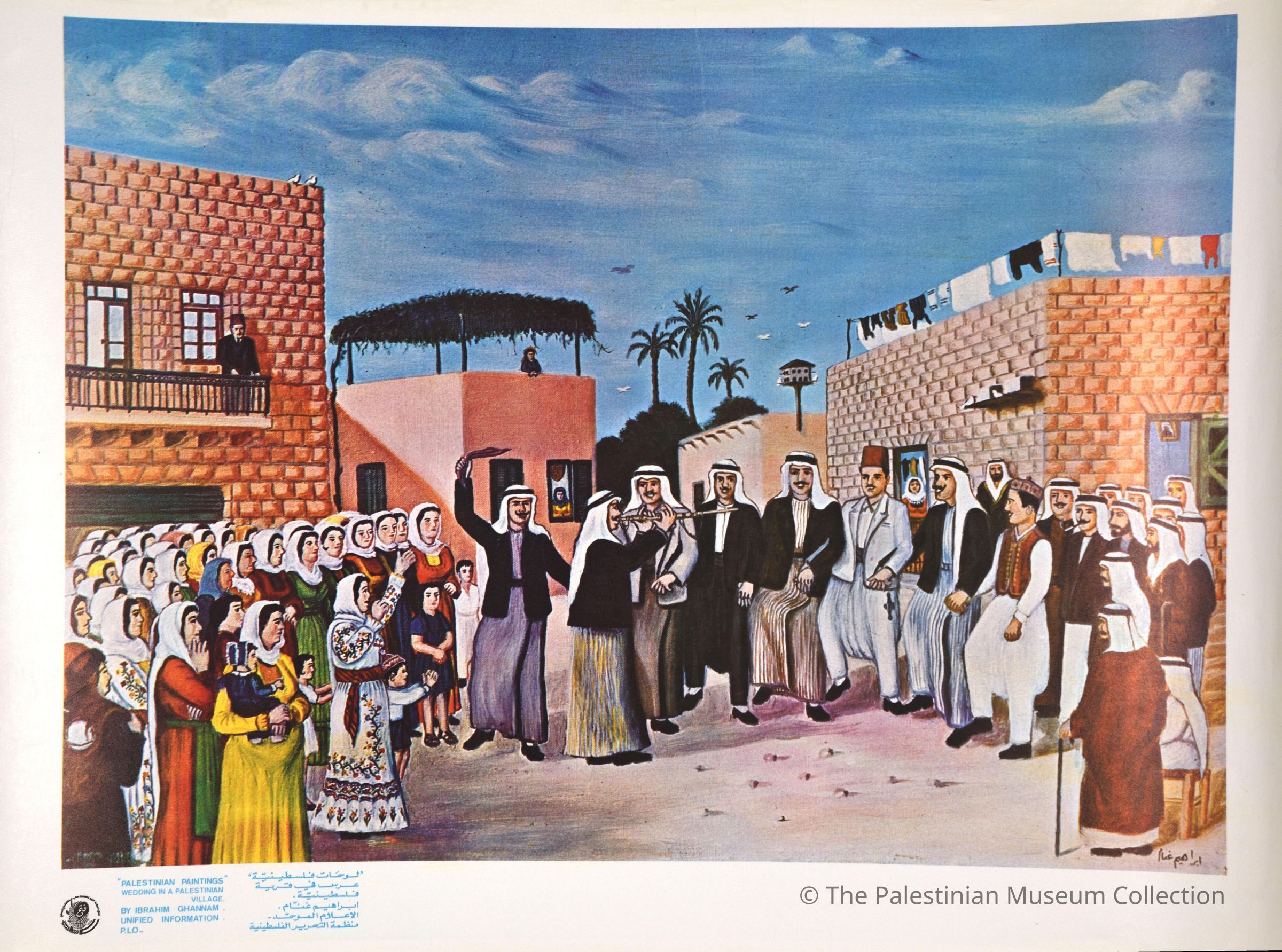 This poster entitled 'Palestinian Paintings, Wedding in a Palestinian Village' features artwork by the artist Ibrahim Ghannam. It was issued by the Unified Information Office of the Palestine Liberation Organisation (PLO). Unknown publication date.