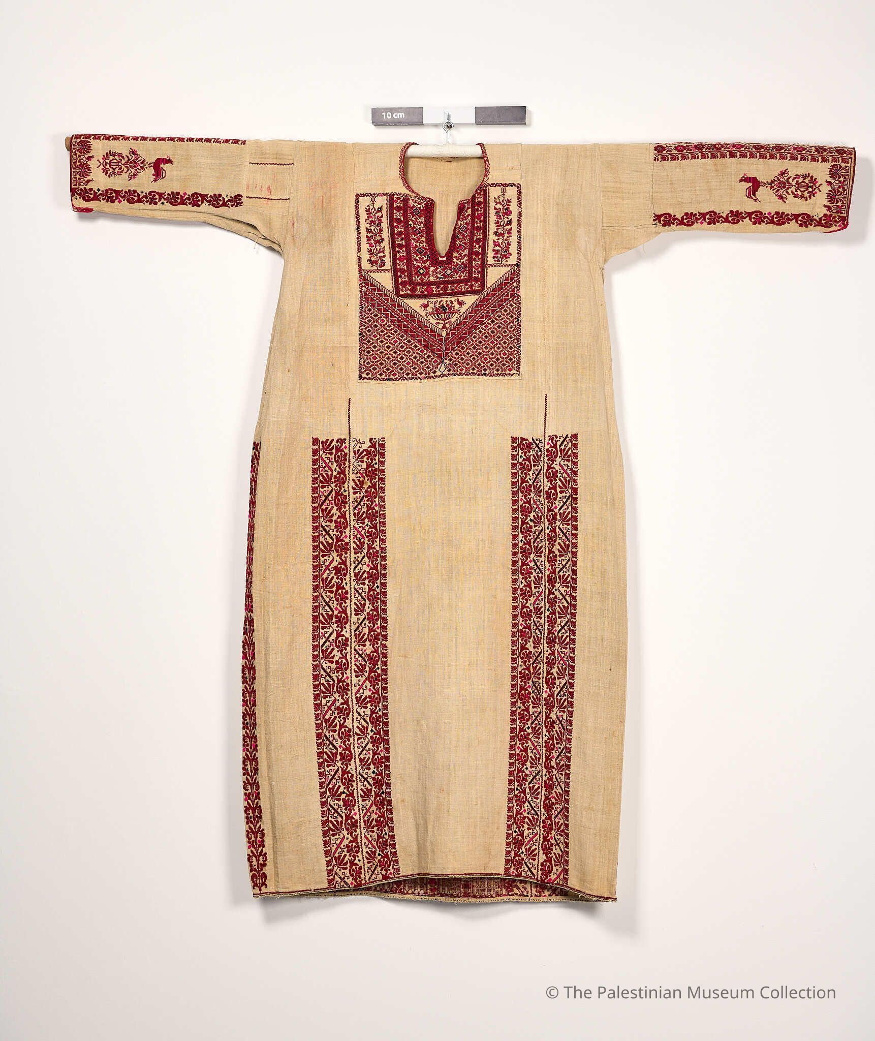A white Rumi thobe (dress) from the Ramallah area made of handmade natural linen fabric and embroidered with the Fallahi (peasant) cross stitch made with predominately red silk threads. The chest panel of the thobe is embroidered with geometric, plant, and animal shapes, among them the rooster motif as seen in the middle. This rooster motif carries religious significance for Christians. The sleeves bear several plant stitch patterns to their ends, with the rooster motif in the middle. The front and back panels of the thobe are embroidered with 6 different plant stitch patterns, 4 of which are identical from front to back and surrounded on both sides by the feather stitch pattern. The sides (al-Banayiq) are embroidered with two plant stitch patterns of differing designs. The lower end/tail area (al-Dhiyal) is adorned with complex tatreez (embroidery) made up of geometric shapes.Made/Created