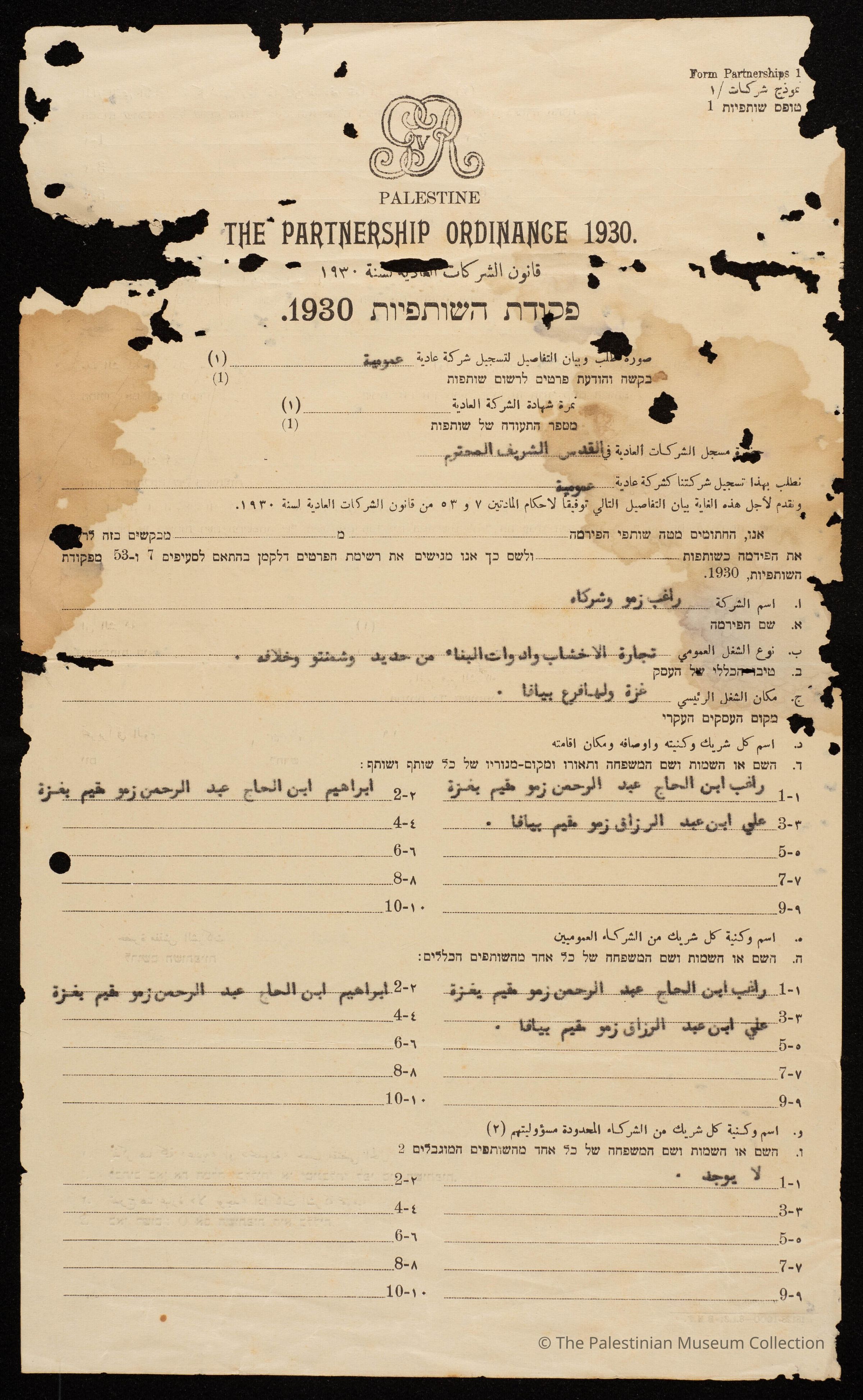 وثيقة، وهي نموذج تسجيل شركة عمومية وفقاً لقانون الشركات الفلسطيني لعام 1930. كُتبت الوثيقة بثلاث لغات: الانجليزية، العبرية، والعربية.