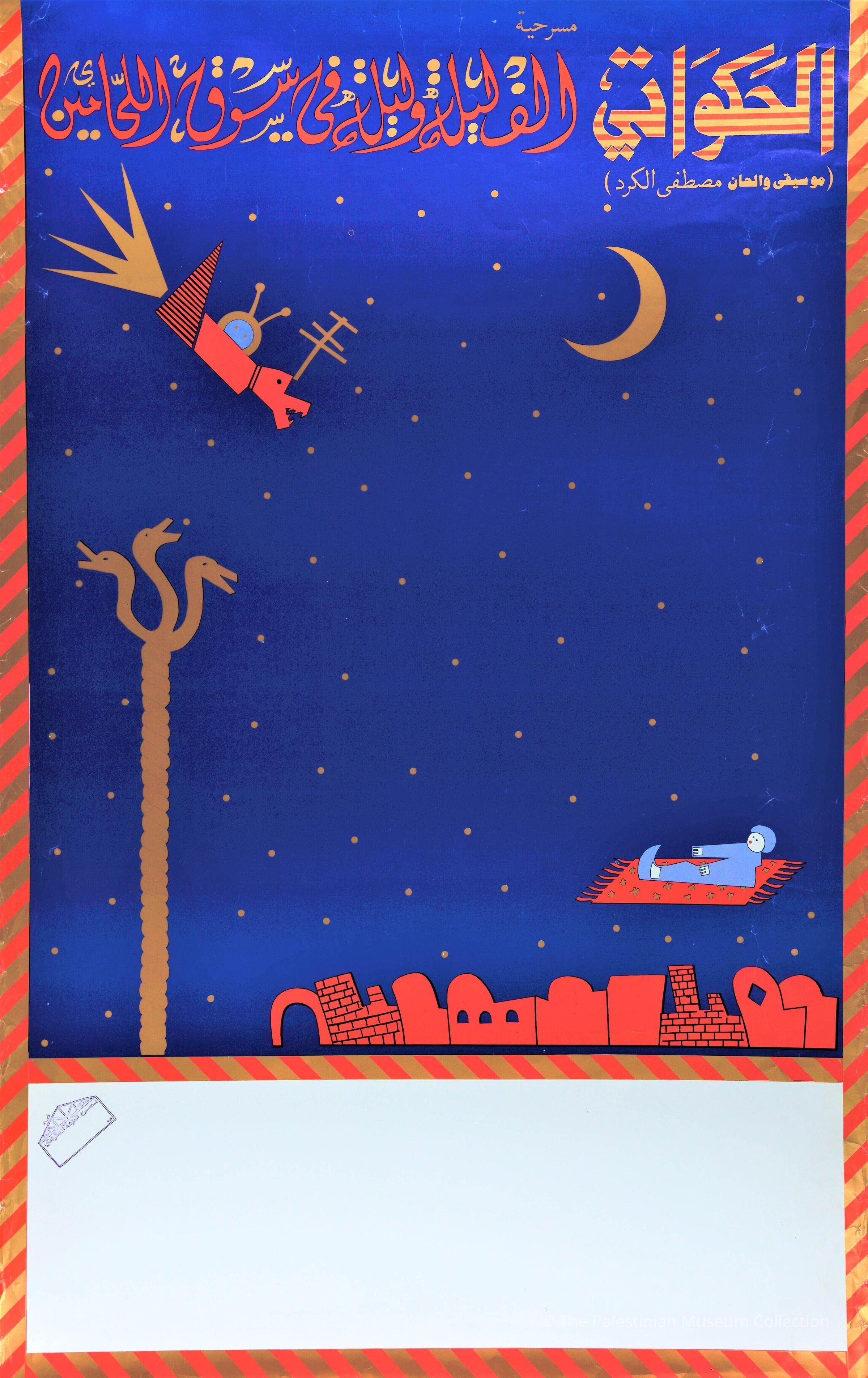 A colour poster showing an advertisement for the "A Thousand Nights and One" play; taking place in Souq al-Lahamén (Butchers Market). The poster shows a variety of children's drawings.