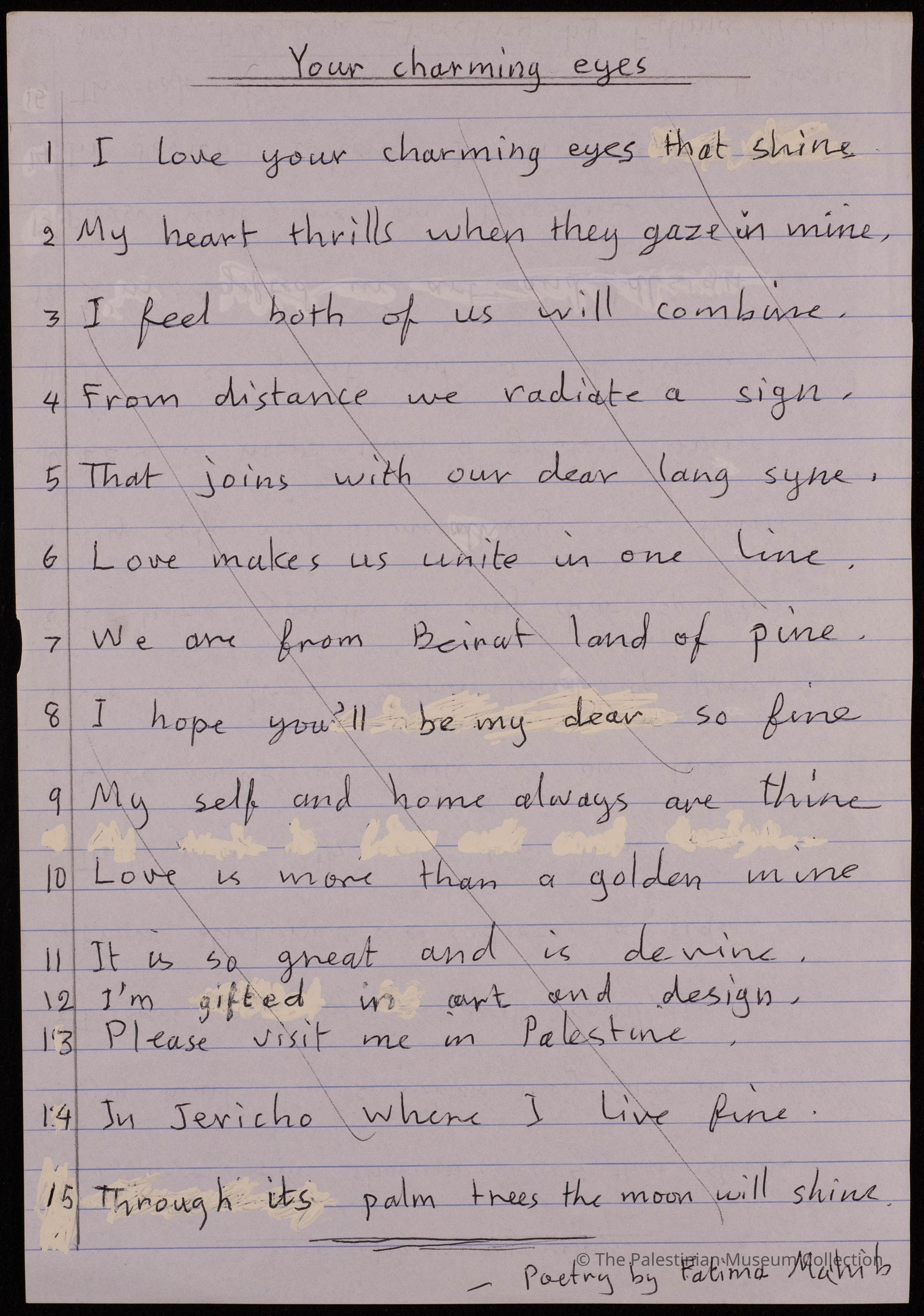 للشاعرة فاطمة المحب،نظمت في اريحا- فلسطين، تتكون من 15 بيت ، قامت الشاعرة بخذفها جميعها واعادة كتابتها بعد التعديل على الوجه الاخرمن الصفحة بذات العنوان، ولا تحمل الوثيقة اية اشارة الى تاريخ كتابتها.
