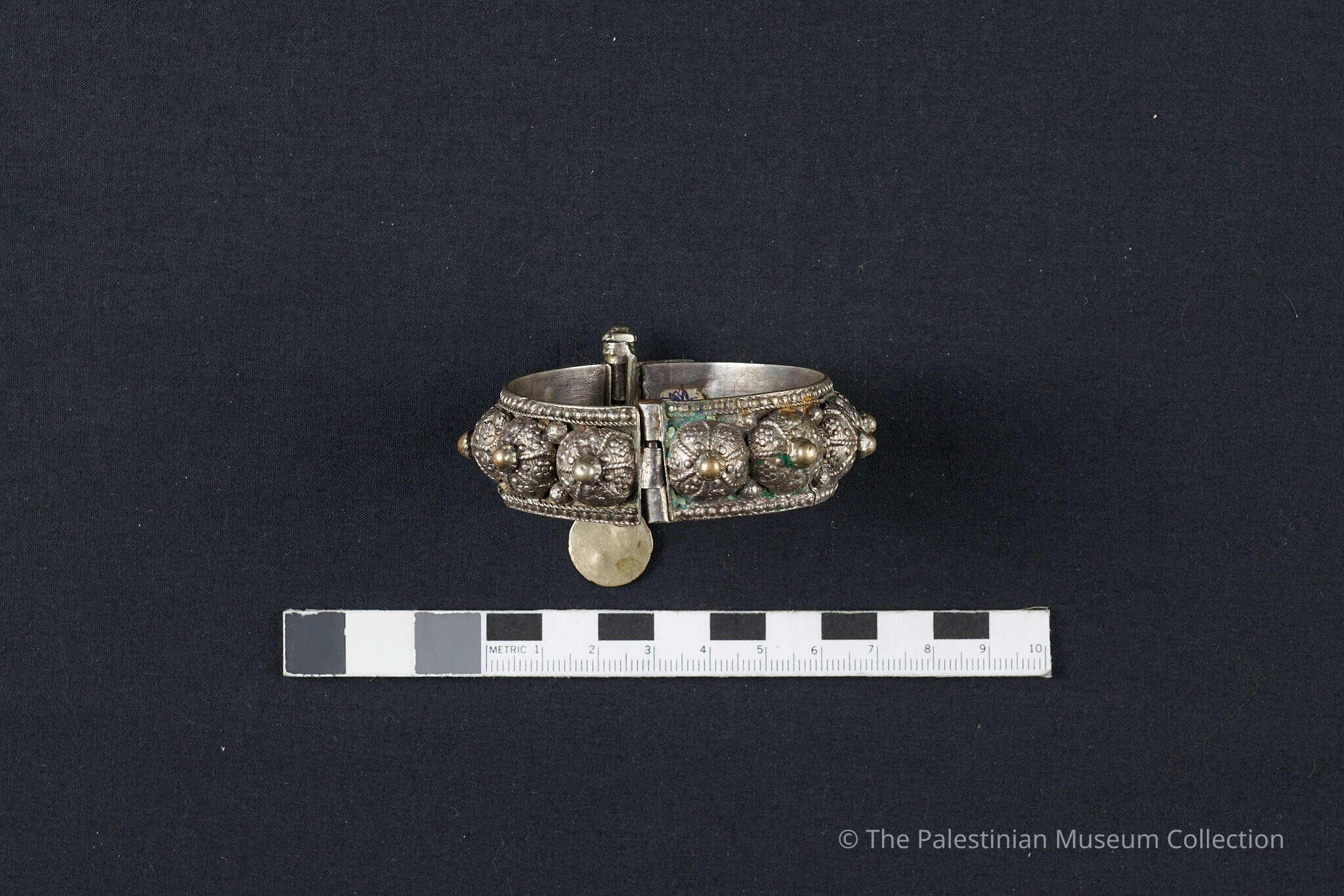 Silver bracelet with round protrusions resembling breasts; the bracelet was worn to indicate that the woman wearing it was breast-feeding. The bracelet is made in the "tarmeel" method, a local jewellery manufacturing method. At one hinge there is a red bead. The bracelet also has a lock and key with a piece of metal resembling a coin on its upper endMade/Created