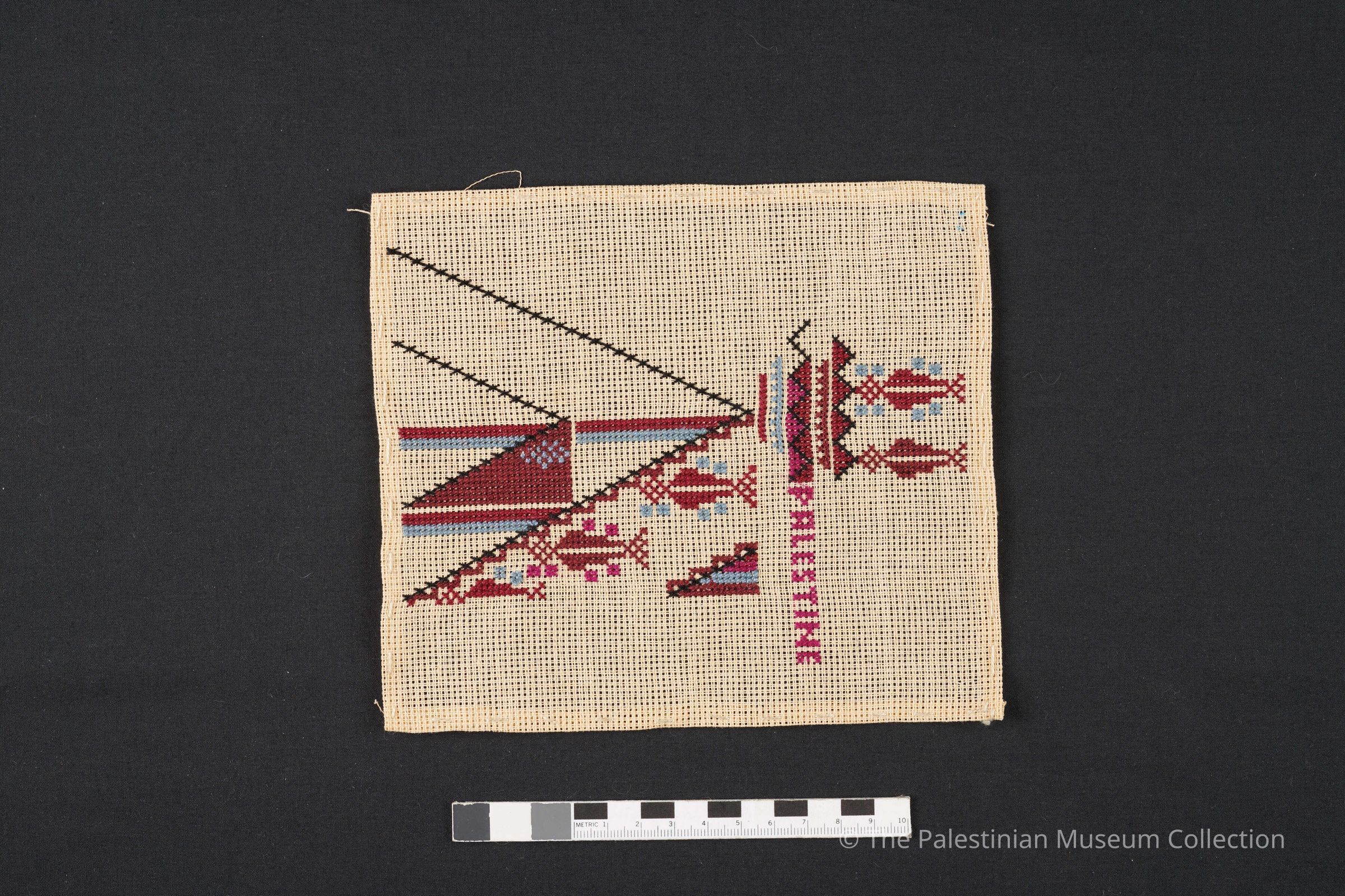 نموذج تطريز على قماش ايتامين بحرير لون اسود وبني وزهري وازرق بعدة رسمات منها السرو وكلمة palestine