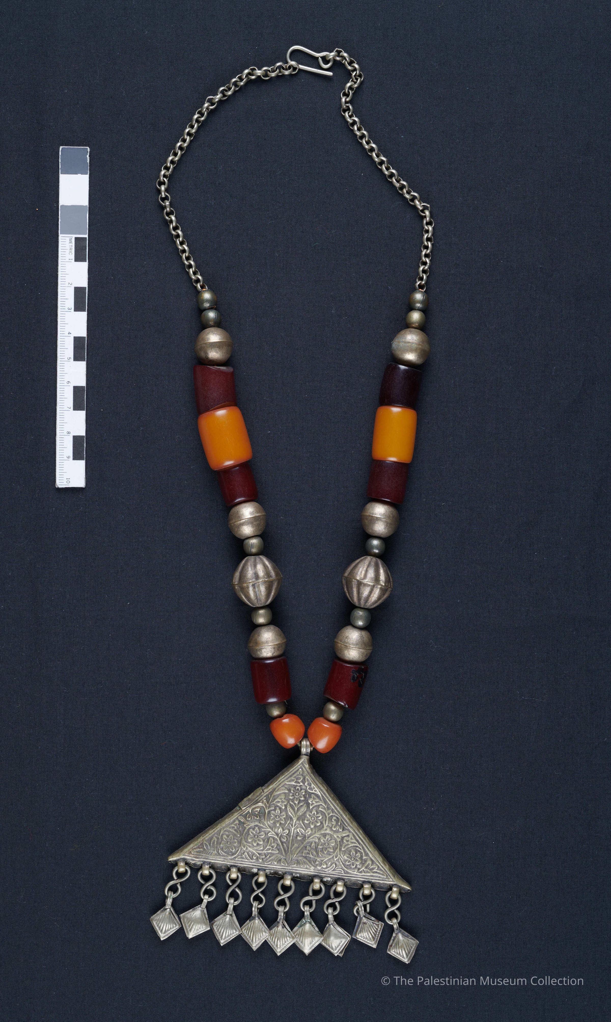 عقد من العنبر الأصفر والعقيق الأحمر، تتخلّله كُرات من الفضّة، تتدلّى منه تعليقة من الفضّة مثلّثة الشكل مزخرفة ومُدندشة، وينتهي بسلسلة من الفضّة لها قفل
