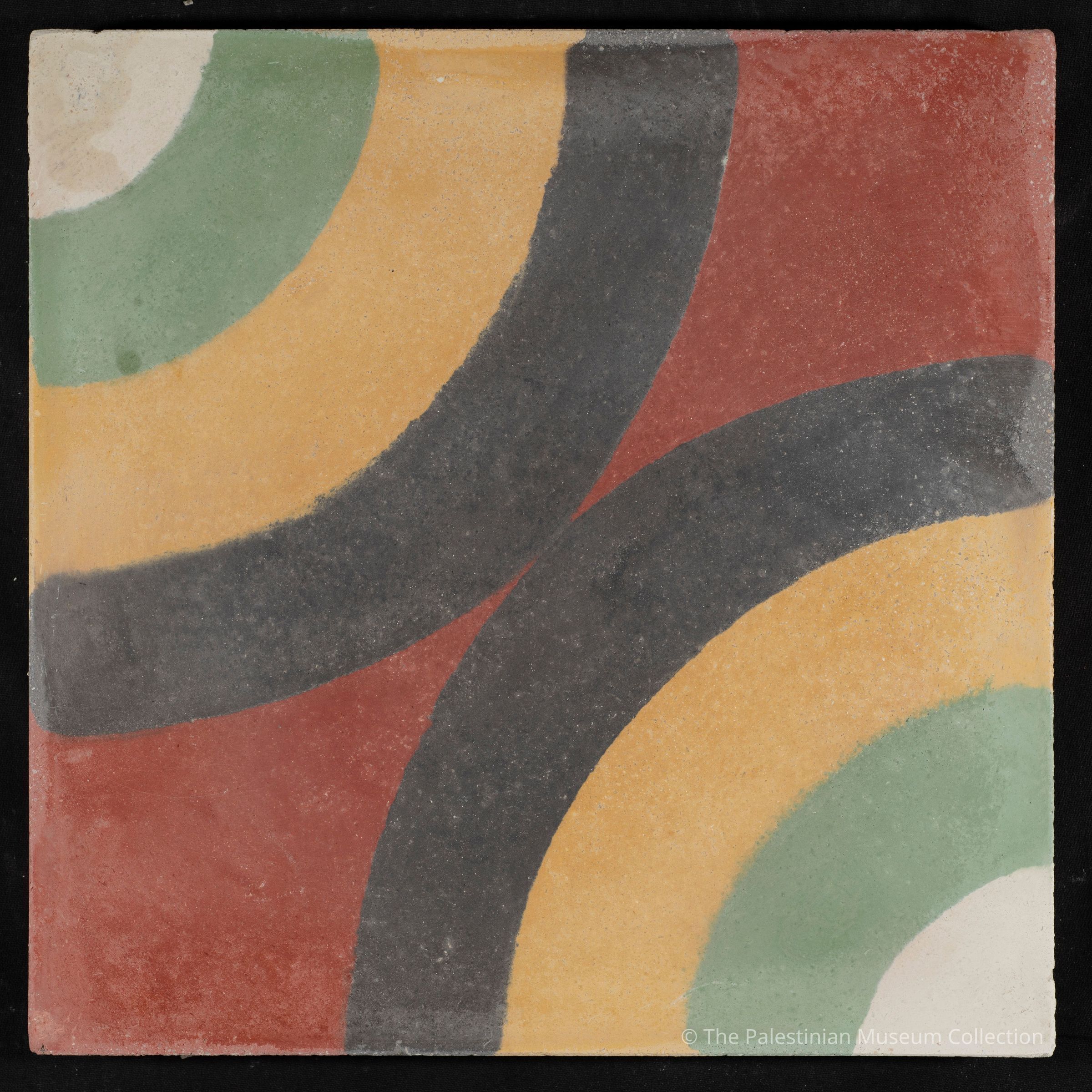 بلاطة إسمنتيّة ملوّنة بحجم 20 × 20 سم، تحمل تصميم "الدوائر"، وهي نموذج حديث سُكبت في قالب يمتلكه مصنع أصلان للبلاط في نابلس يعود إلى ستينيات القرن العشرين.