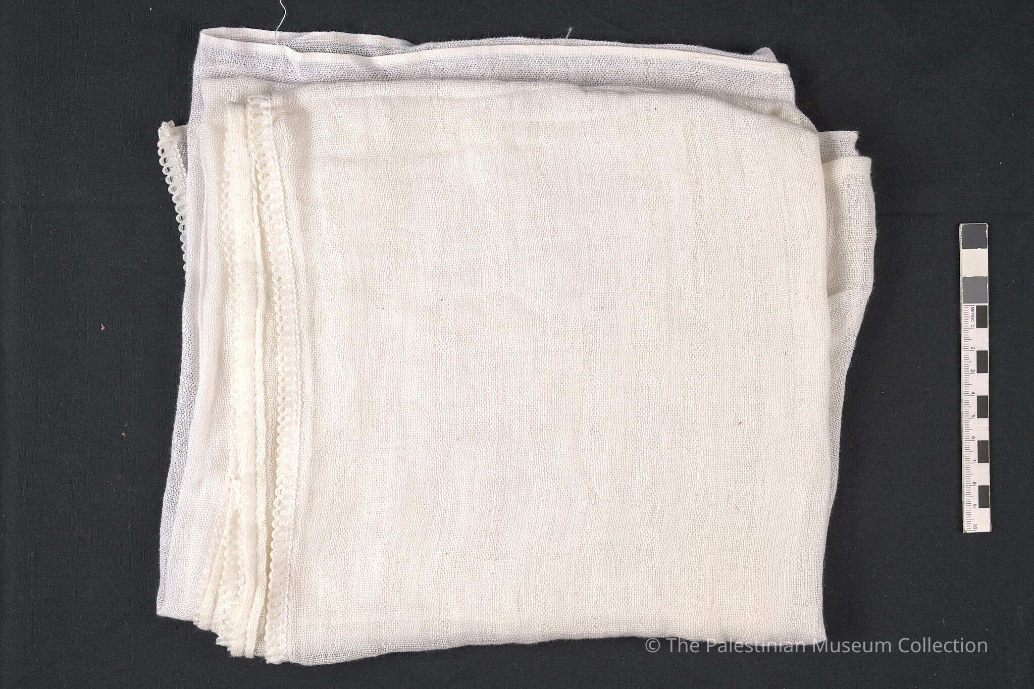 A white cotton shawl (cloth) from Bethlehem which would be worn on the head and is hand-stitched at all its edges.Made/Created