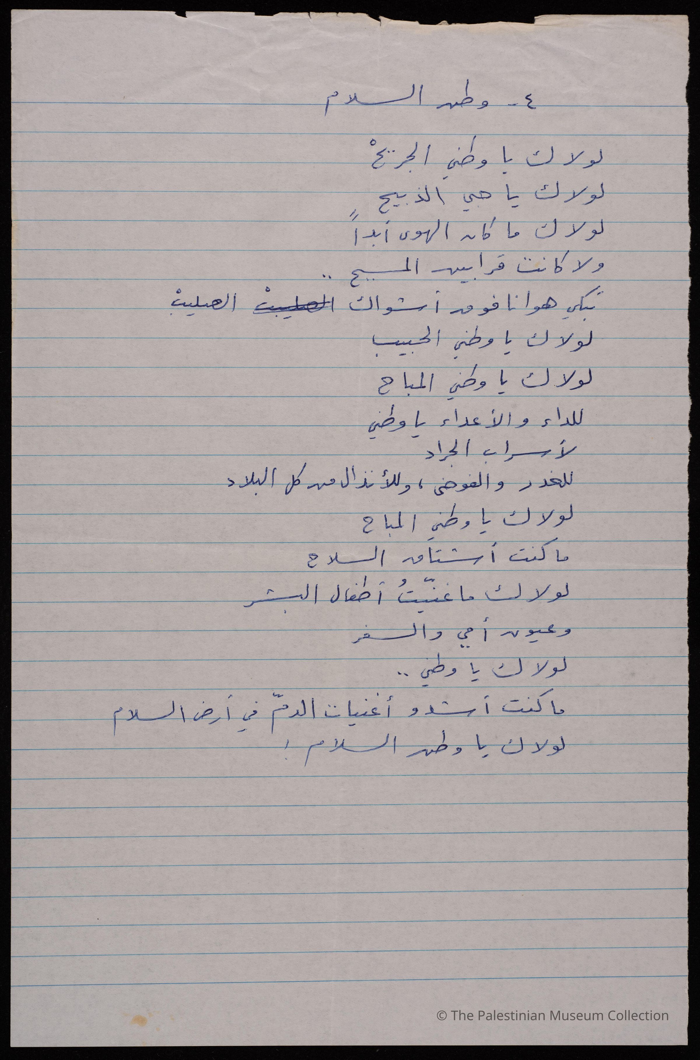 قصيدة وطن السلام من ديوان أغنيات الوطن، تحتوي على مجموعة من مقاطع النثر للوطن، كتبت بخط يد الشاعر علي فودة.