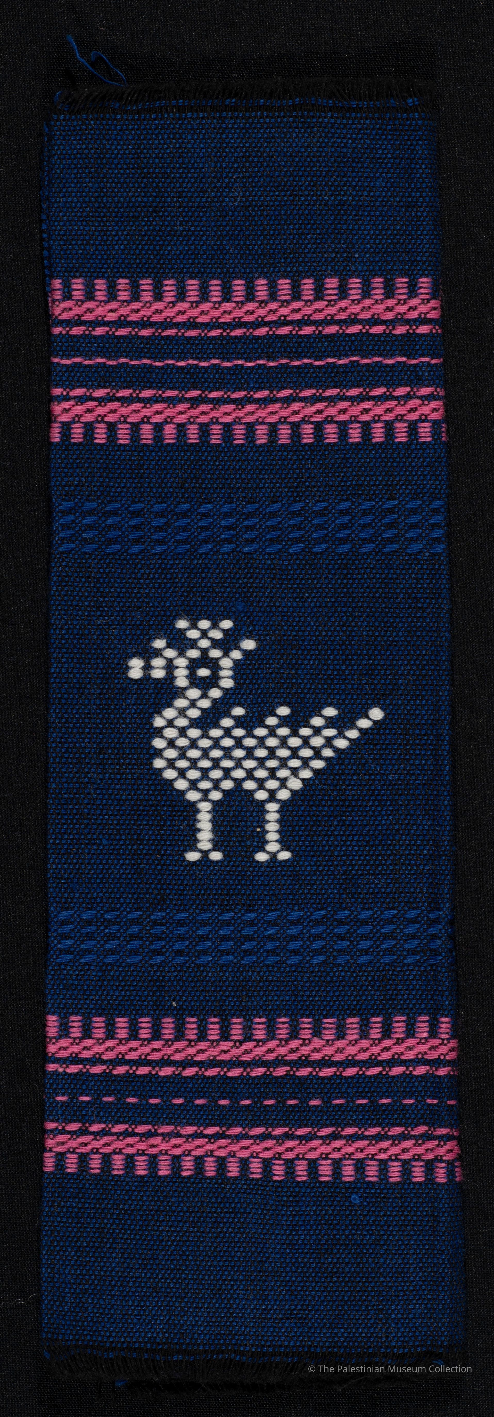 منديل سفرة من قماش الكتان باللون الكحلي، مربع الشكل، ومُطرّز بقطبة الصليب الفلاحية بخيوط حرير باللون الزهري والأزرق والأبيض بخطوط أُفقية وشكل بطة.
