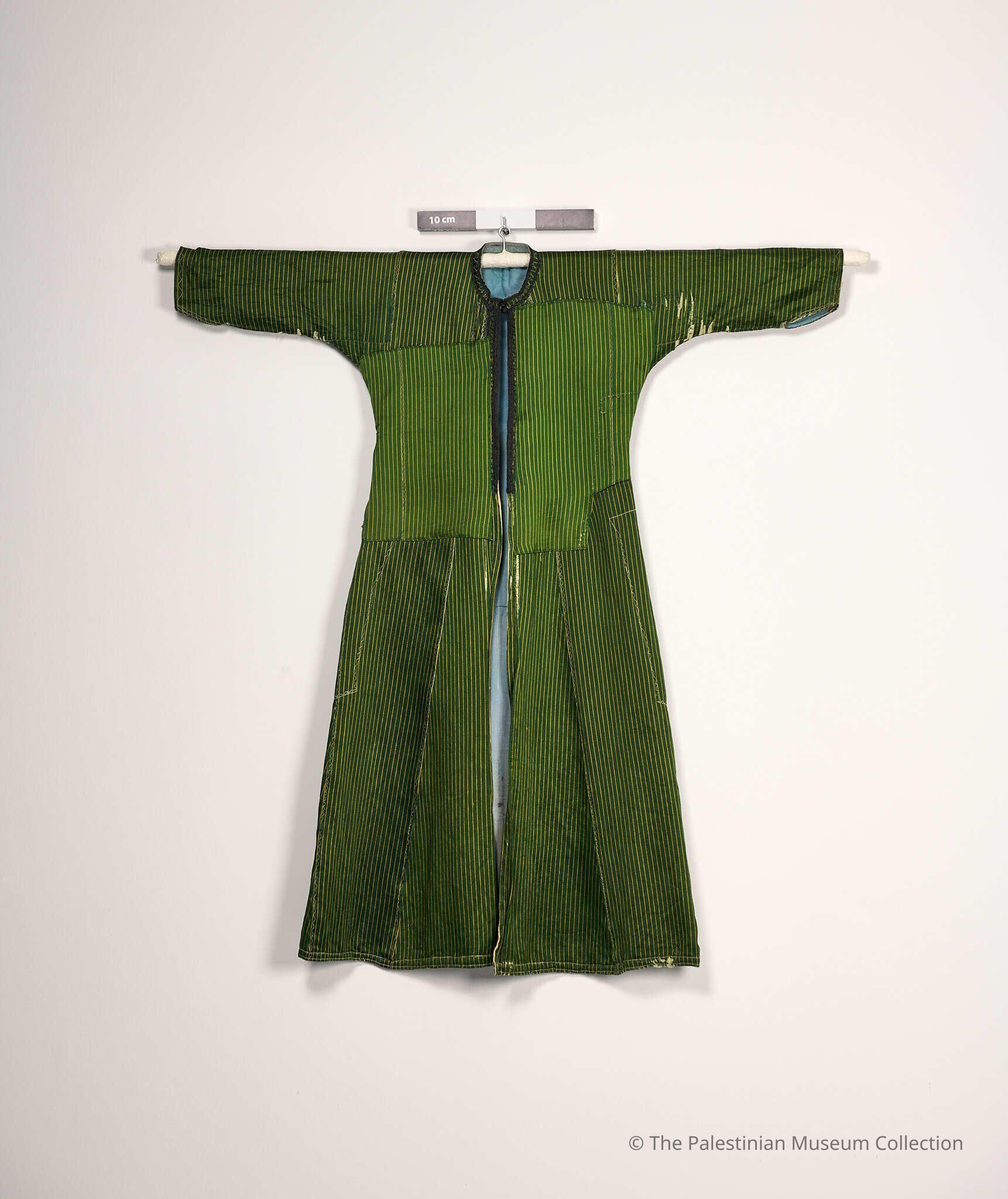 Jalaya (overcoat) thobe from Nablus and Tulkarm. It is made of green silk fabric striped with yellow, whereas its inside is made of black linen. It is open from the top of the chest panel to the bottom of the thobe in a form of a coat and is distinguished by its minimal tatreez (embroidery). The chest panel has hand stitching. As for the sleeves, they are characterised by their short length because they were to be worn over a white thobe (dress) whose embroidered mradan (long triangular sleeves) drape out of the jalaya. Moreover, the jalaya also features pockets on both sides.Made/Created