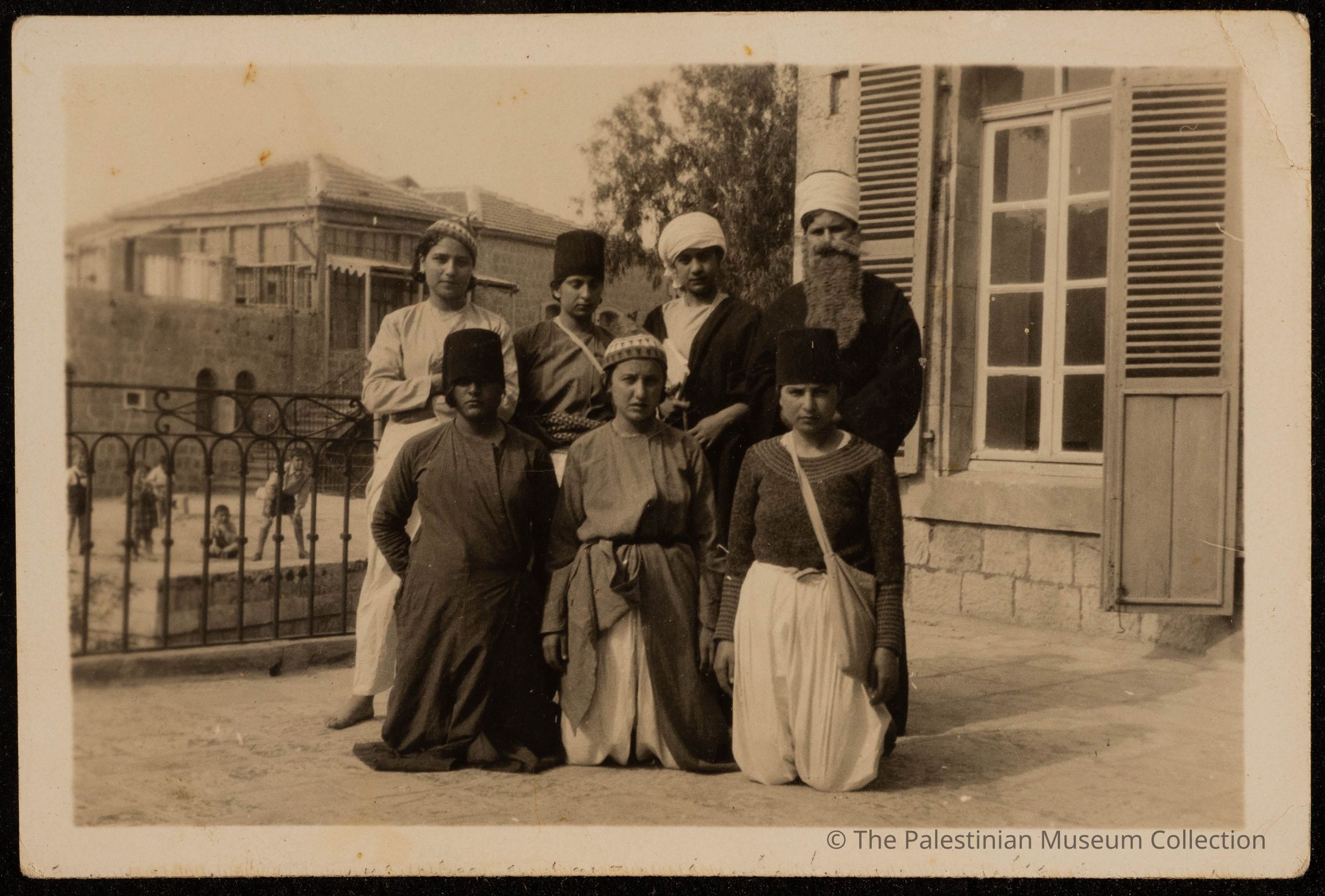 صورة للطبيبة زينب المحب مع اسما عطية من القدس وصبيحة عرفات من نابلس وزبيدة من الناصرة وتحية عوايص وعطية حلاوة من نابلس وعصام حمدي الحسيني من غزة، يرتدون زي خاص بمسرحية، التقطت الصورة الفنانة فاطمة المحب.