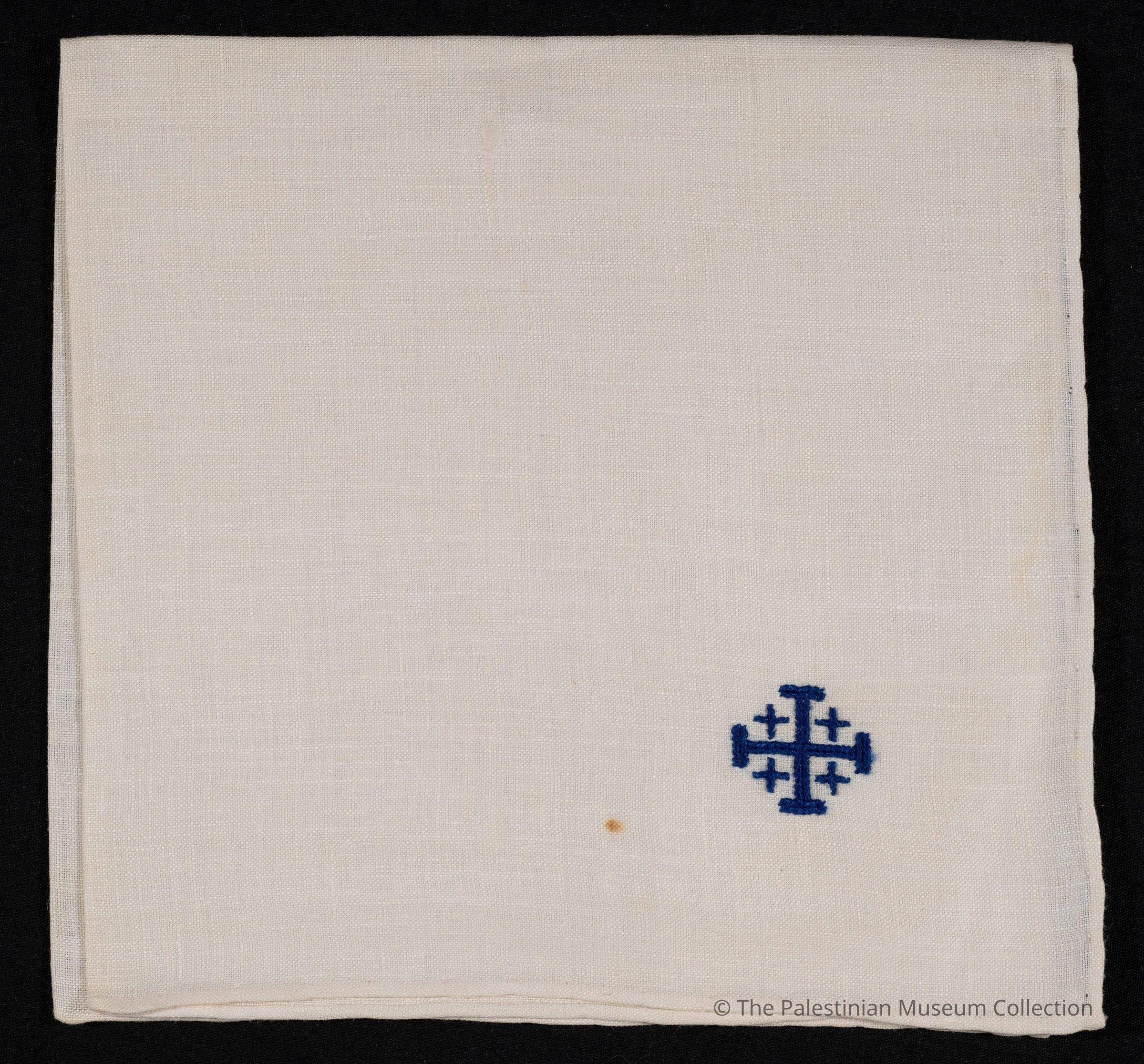 A table napkin made of beige linen. It has an embroidery in the shape of the Roman cross using the Fallahi (peasant) cross stitch. It was produced by the Arab Refugees Handicrafts Center in Jerusalem, owned by Asia Jeries Halabi.