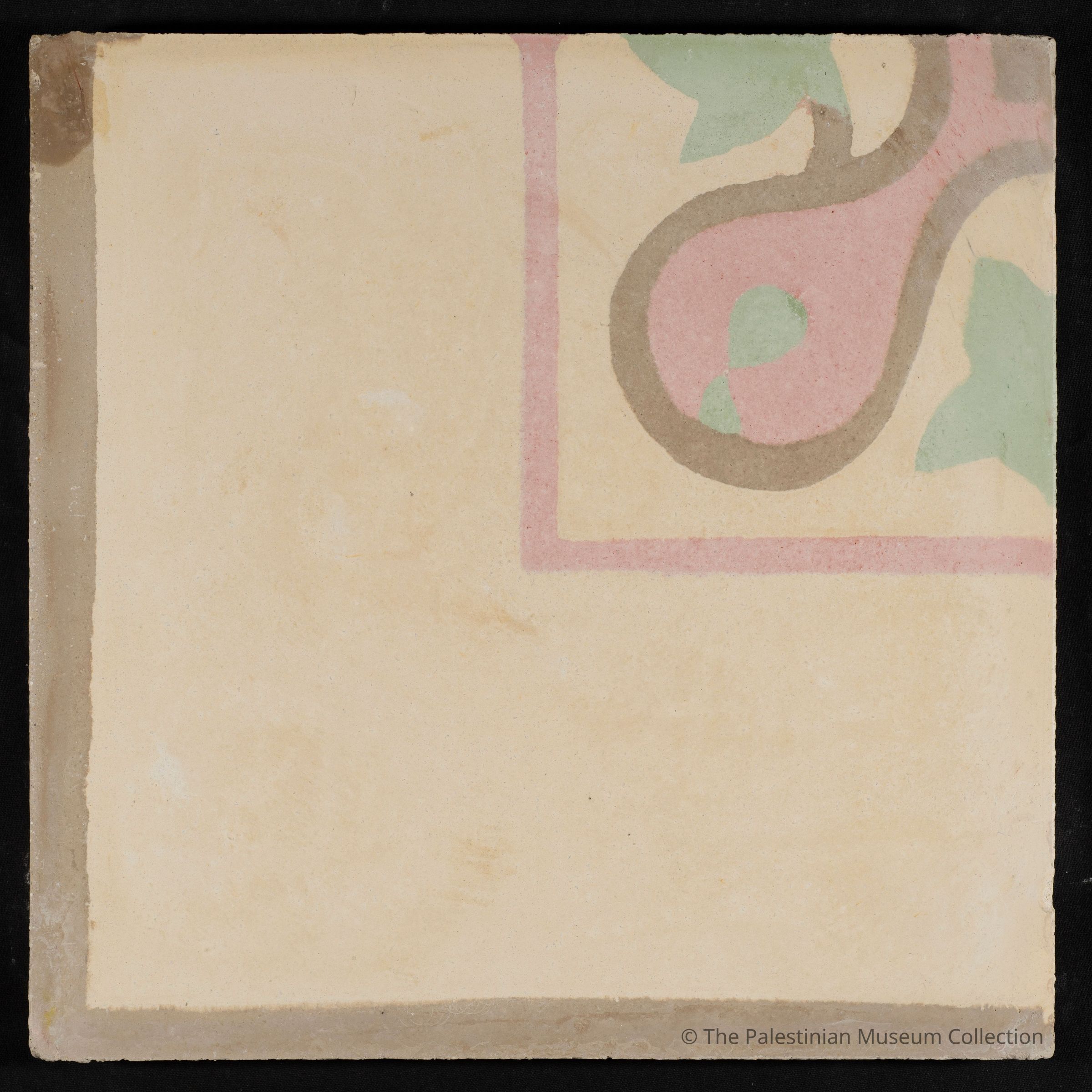 A 20 × 20 cm coloured cement tile featuring the "Corner of An-nos (the Central)" design. This tile is a contemporary reproduction, cast using an original mold from the Aslan Tile Factory in Nablus, which dates back to the 1920s.Made/Created