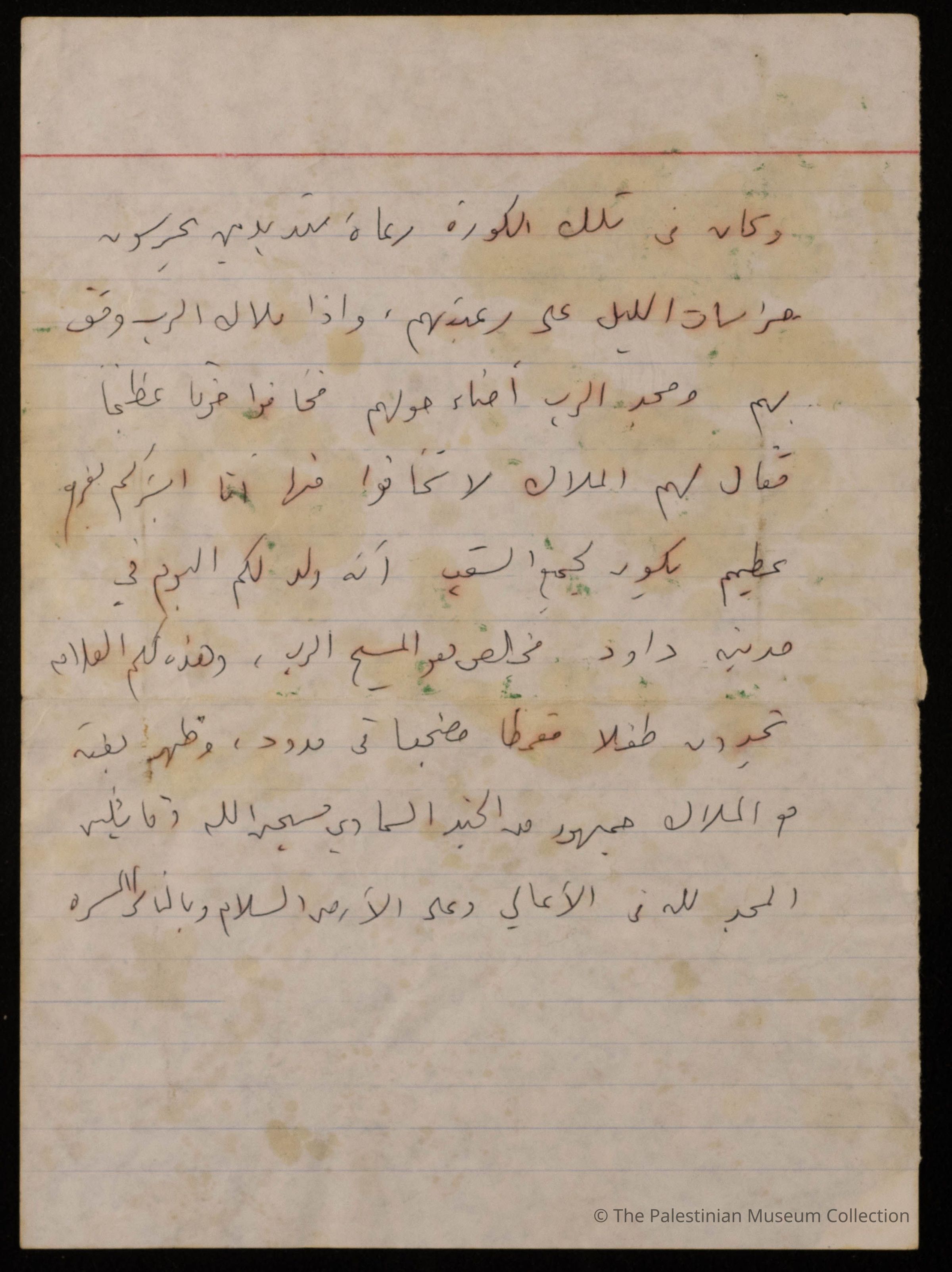 مخطوطة وثيقة باللغة العربية بلا عنوان، وهو نص من انجيل لوقا يتحدث عن ميلاد السيد المسيح، قامت الشاعرة فاطمة المحب باعادة كتابته، ولا تحمل الوثيقة اية اشارة الى تاريخ كتابتها