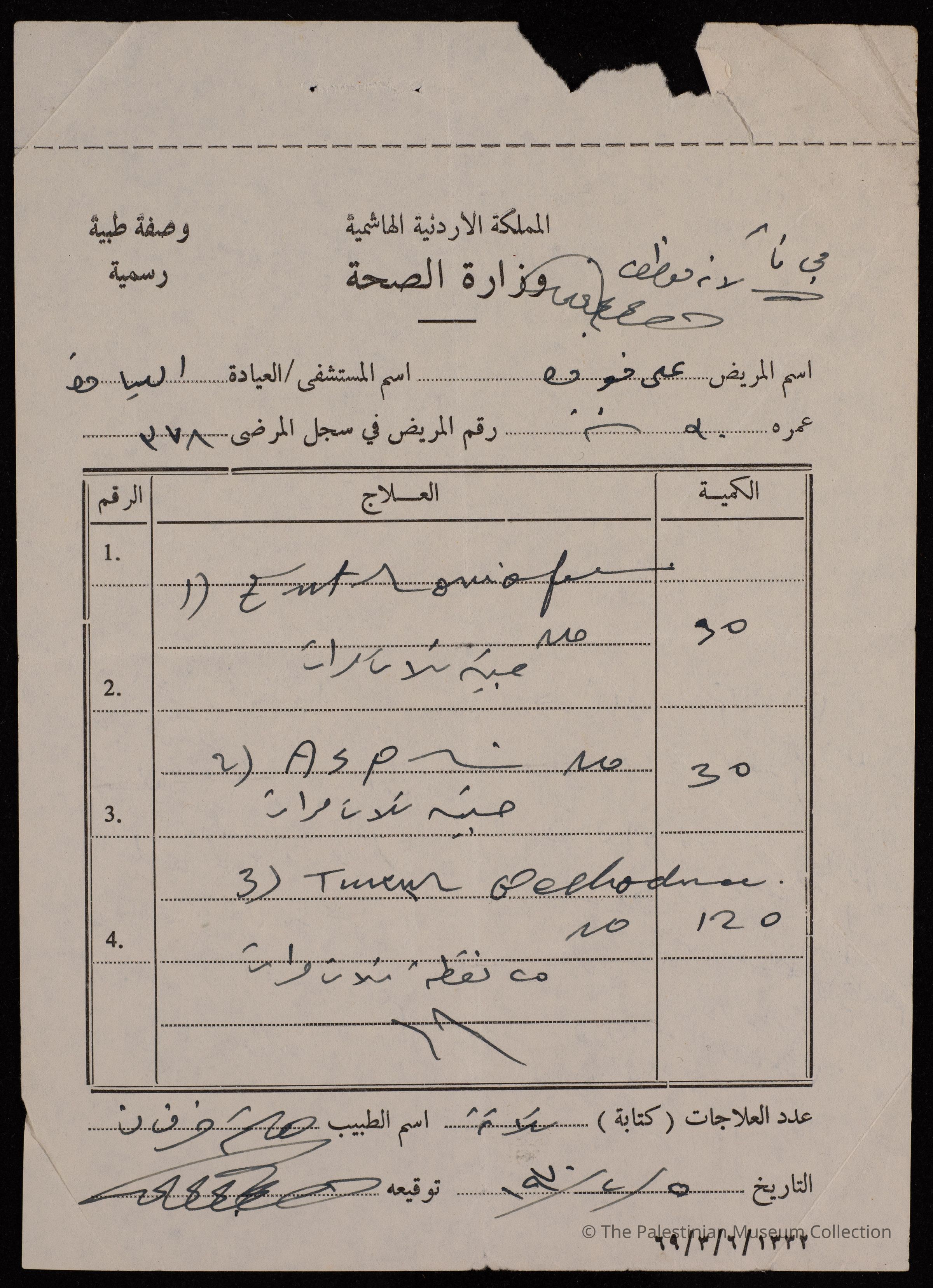 An official prescription issued by the Ministry of Health in the Hashemite Kingdom of Jordan for Ali Foda. The prescription contains the patient's details and a table of medication names. There are verses of poetry on the back.