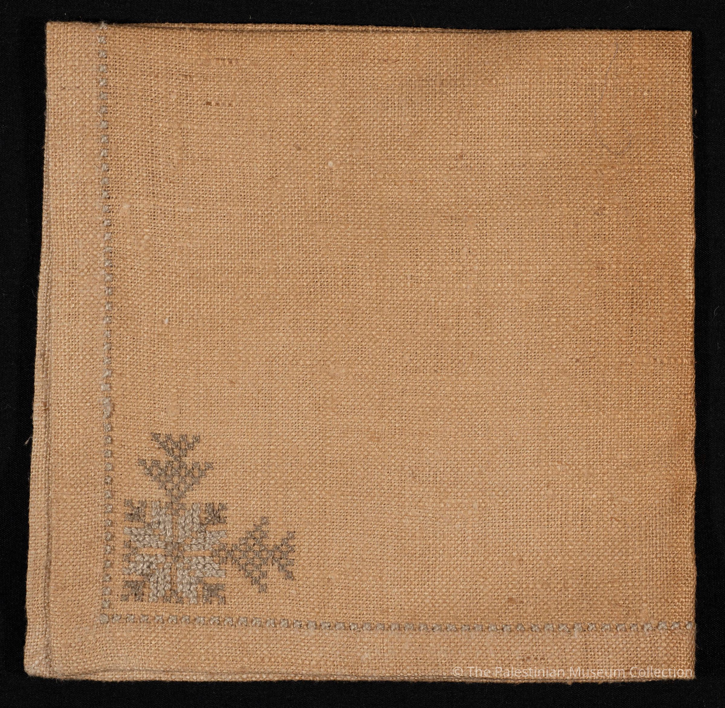 A table napkin made of beige linen. It has a light embroidery of a plant motif on its corner using the Fallahi (peasant) cross stitch. It was produced by the Arab Refugees Handicrafts Center in Jerusalem, owned by Asia Jeries Halabi.
