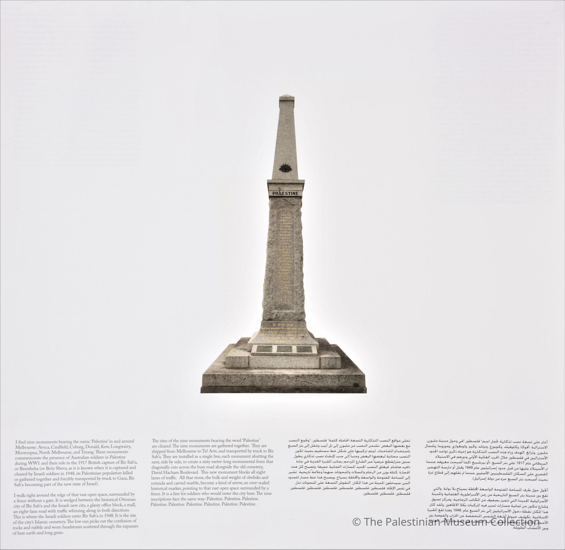 Proposition for a monument, articulated as two-sided off-set printed poster, each 50 × 50 cm, for visitors to take away, and also pasted up around Ramallah, this colour poster shows a monument commemorating the presence of Australian soldiers in Palestine during World War I and their role in the 1917 British capture of Beʾr as-Sabeʿ.