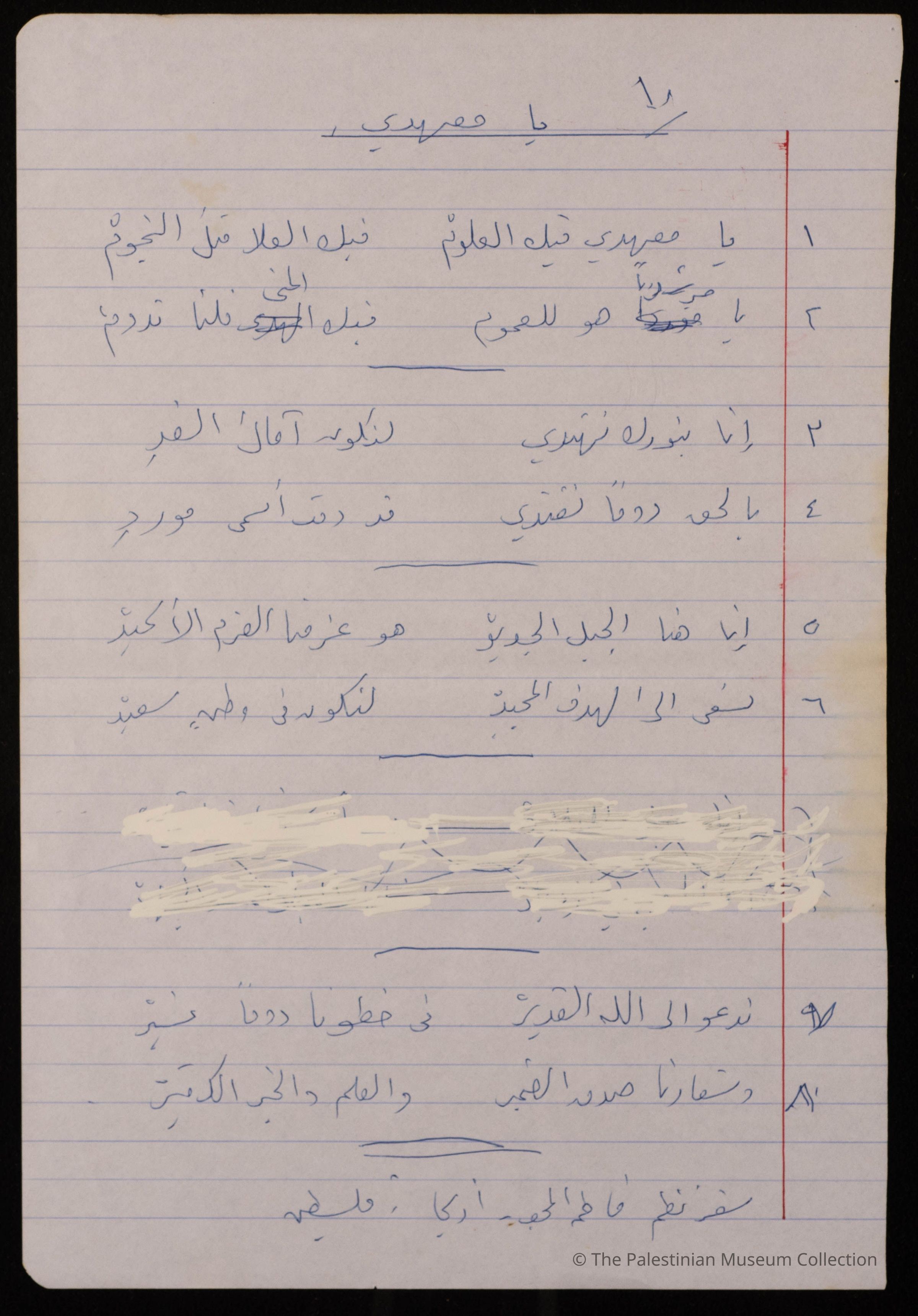 مخطوطة قصيدة باللغة العربية بعنوان" يا معهدي" للشاعرة فاطمة المحب، نظمت في اريحا- فلسطين ، ولا تحمل الوثيقة اية اشارة الى تاريخ كتابتها