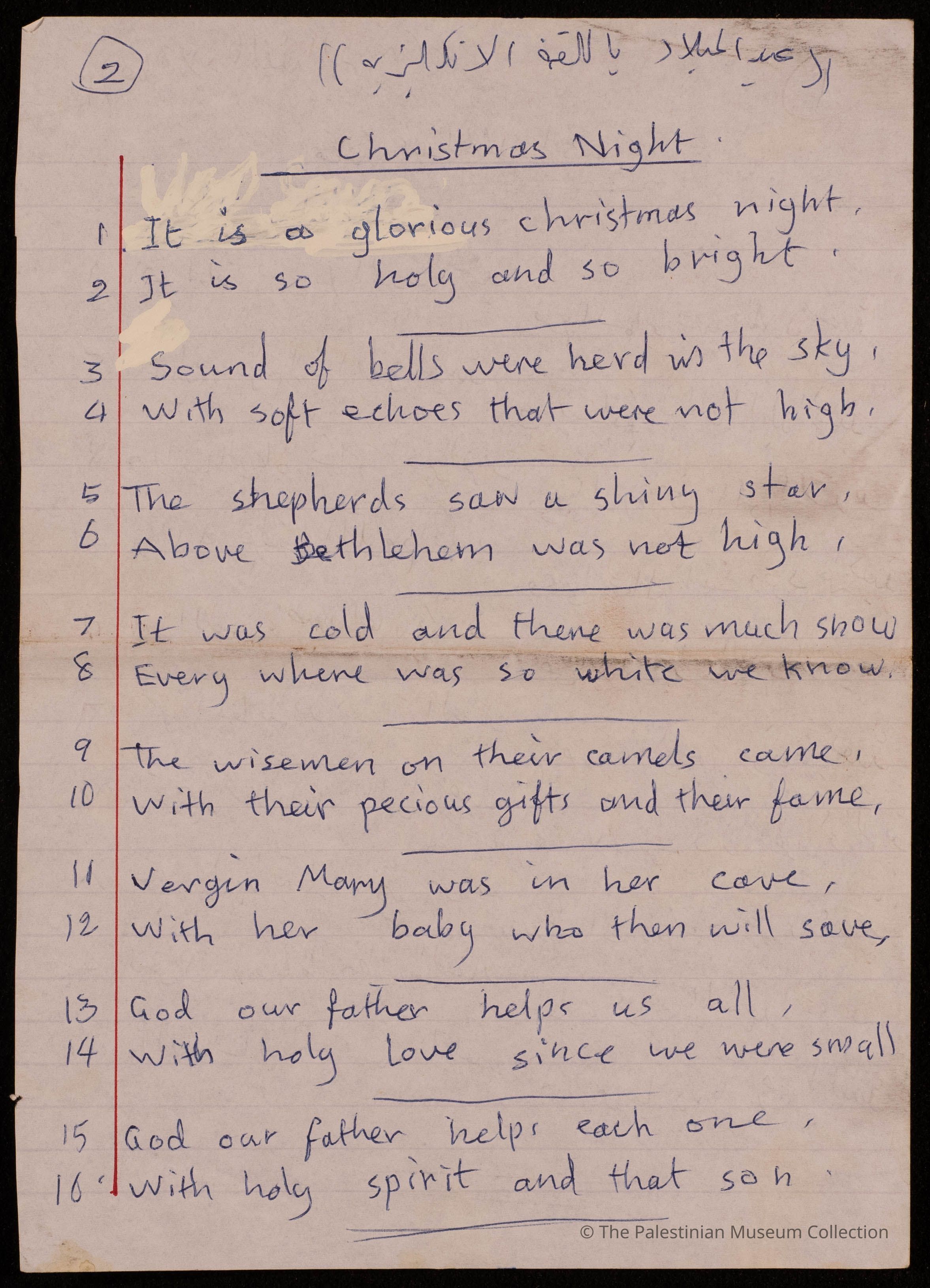 مخطوطة قصيدة باللغة العربية بعنوان " " قصة عيد الميلاد المجيد" للشاعرة فاطمة المحب ، ولا تحمل الوثيقة اية اشارة الى تاريخ كتابتها .