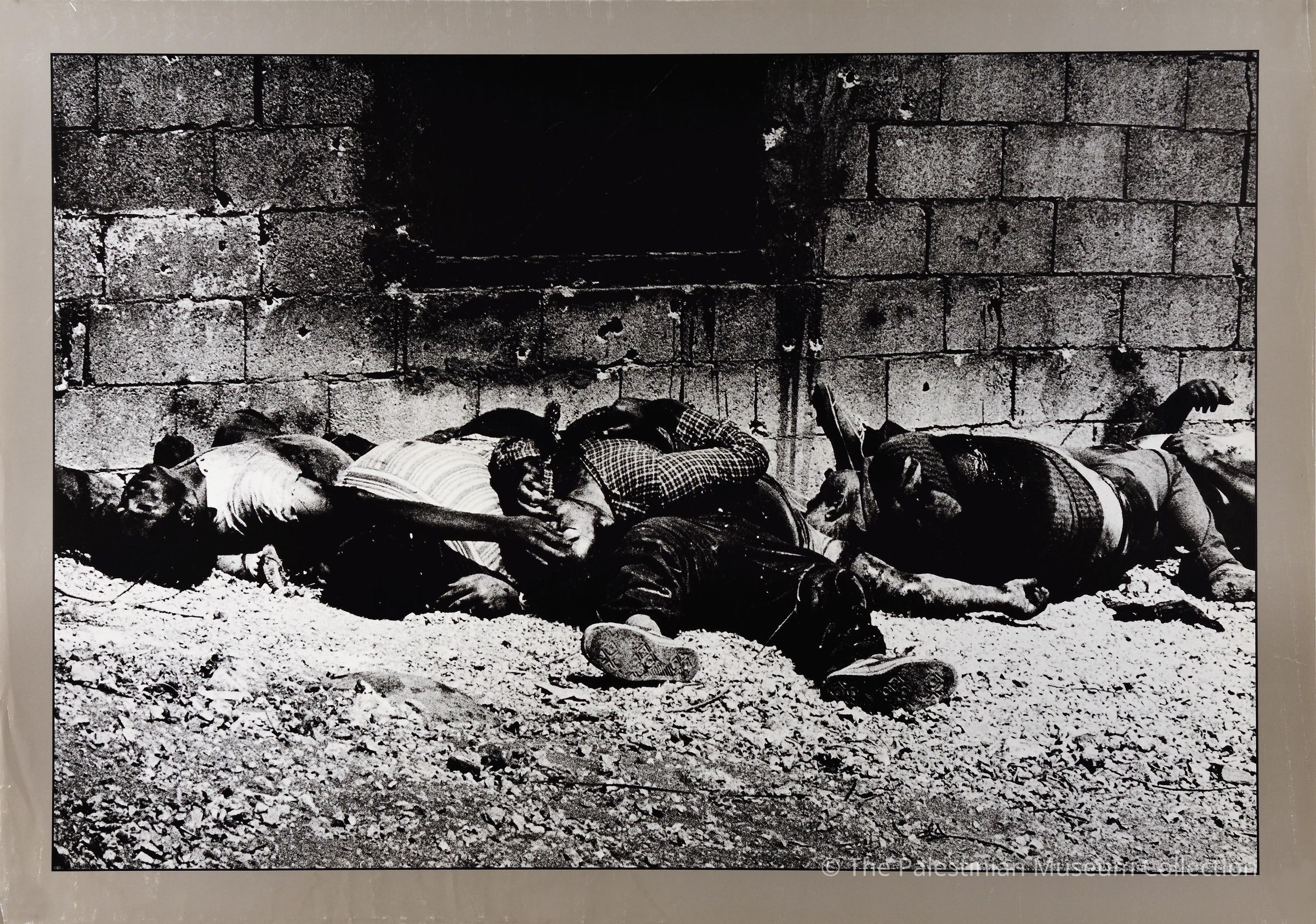 ملصق يوثق صورة لمجموعة من جثامين شهداء مجزرة صبرا وشاتيلا، 1982. A poster showing a photograph of a few of the Sabra and Shatila Genocide shaheeds (shuhada'), 1982.