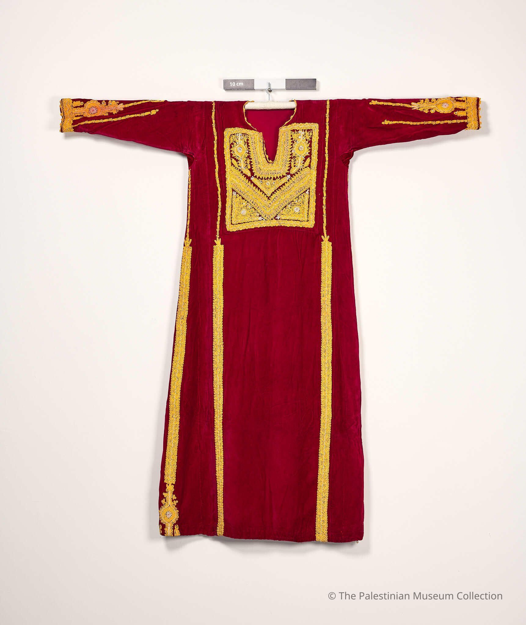 A red velvet thobe (dress) from Qalandia, Jerusalem. It is embroidered with gilded qasab (metallic couching cord). The chest panel is embroidered with plant and geometric shapes using a Tahriri (couching) stitch and adorned with multi-coloured beads. As for the shoulders and the back of the chest panel (the upper back neckline), they bear no tatreez (embroidery). The sleeves are embroidered with watch motifs using a Tahriri stitch, whereas the cuffs have a tatreez of plant and geometric shapes. The front and back panel have a light tatreez of two parallel stitch patterns of geometric shapes. Moreover, the bottom of the back panel is embroidered with stitch patterns of plant and geometric shapes and a watch motif. The right side solely (al-Banayiq) has a tatreez of stitch pattern with a watch motif on its end.Made/Created