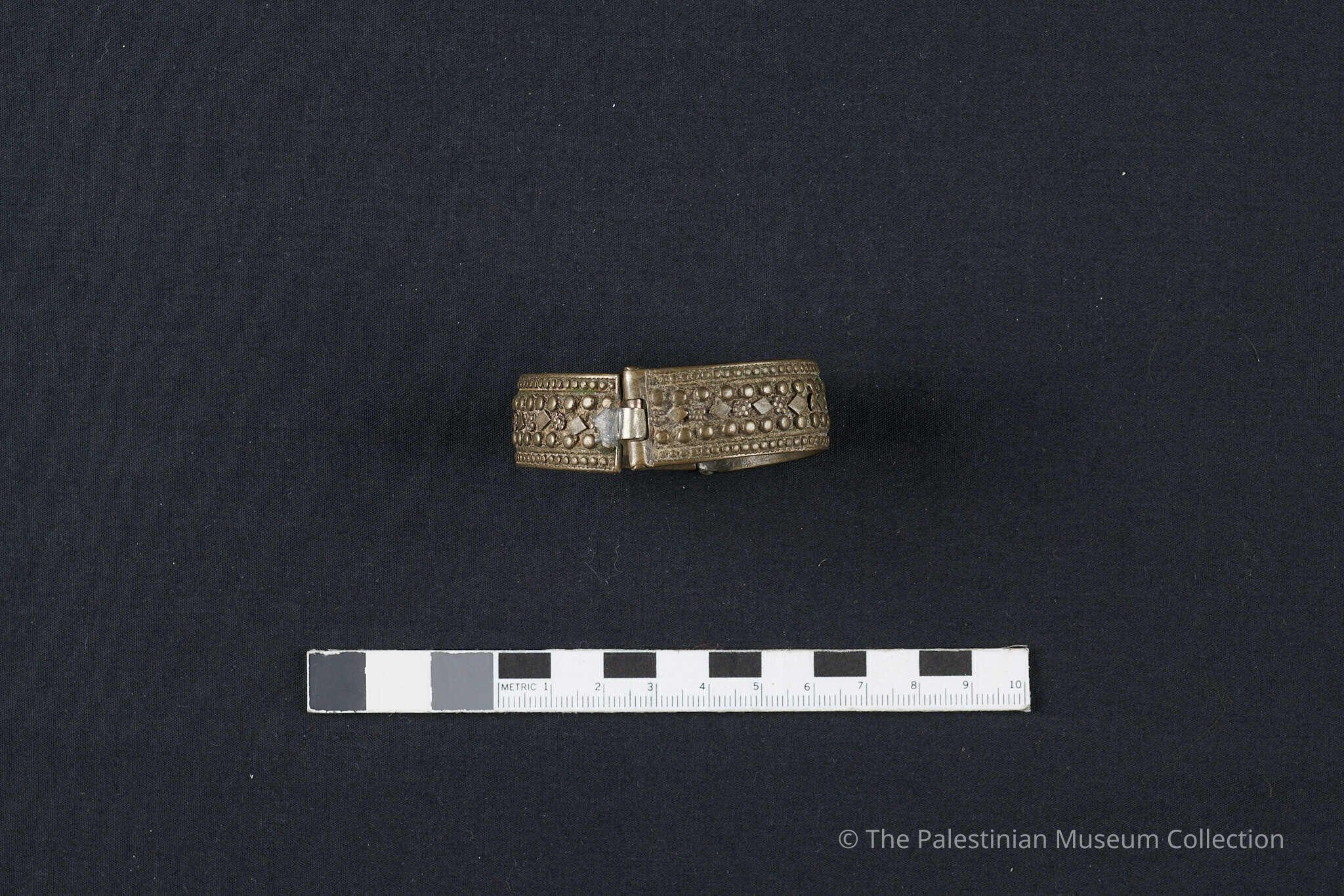 Silver bracelet decorated in the “tarmeel” method, a local jewellery manufacturing method. It has circles of roses and diamond shapes and ends with a claspMade/Created