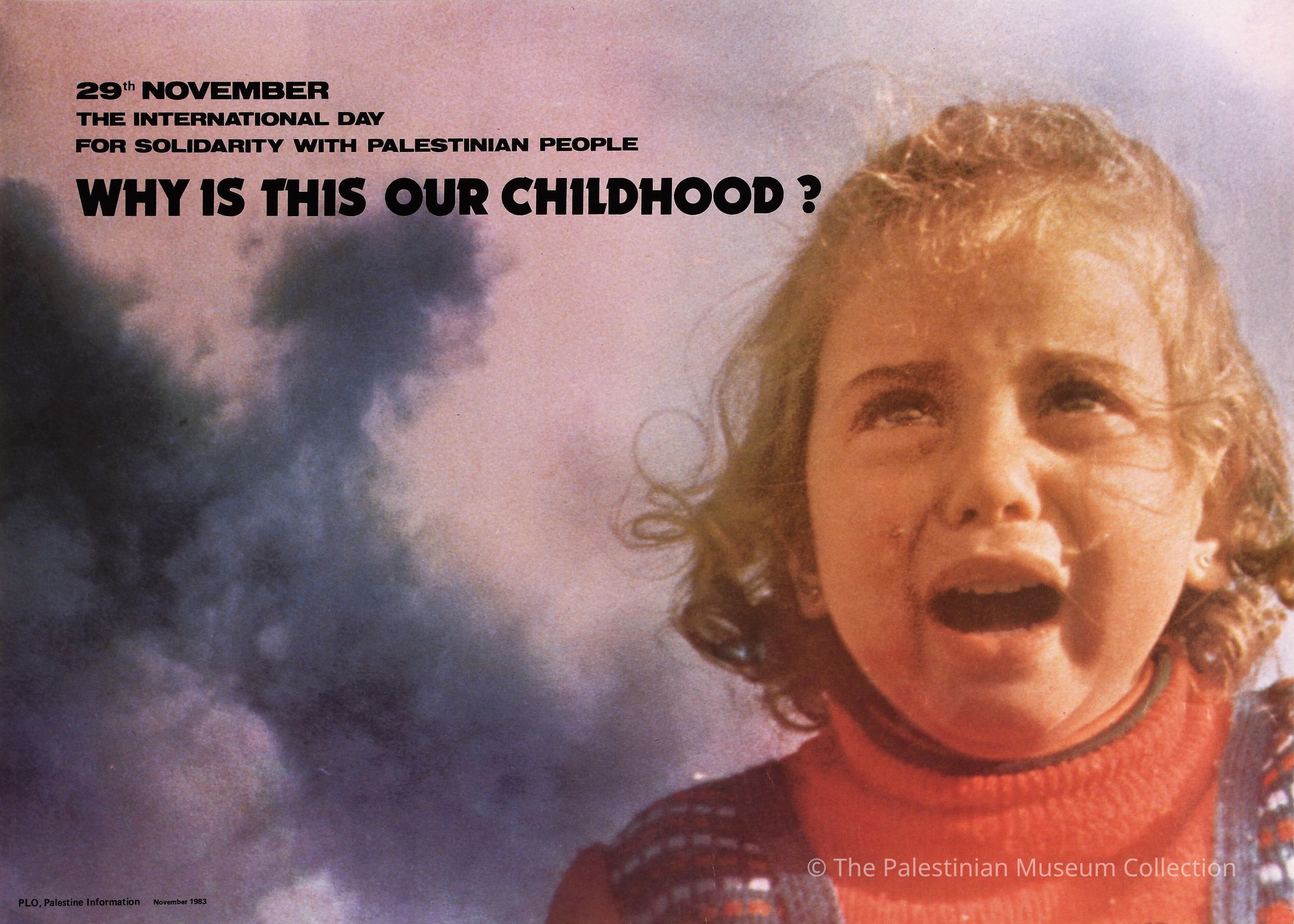 ملصق ملون، يظهر فيه طفلة تبكي، نر اللصق بمناسبة اليوم العالمي للتضامن مع الشعب الفلسطيني. Published on the Solidarity with Palestinians Day, this colour poster shows a crying child.