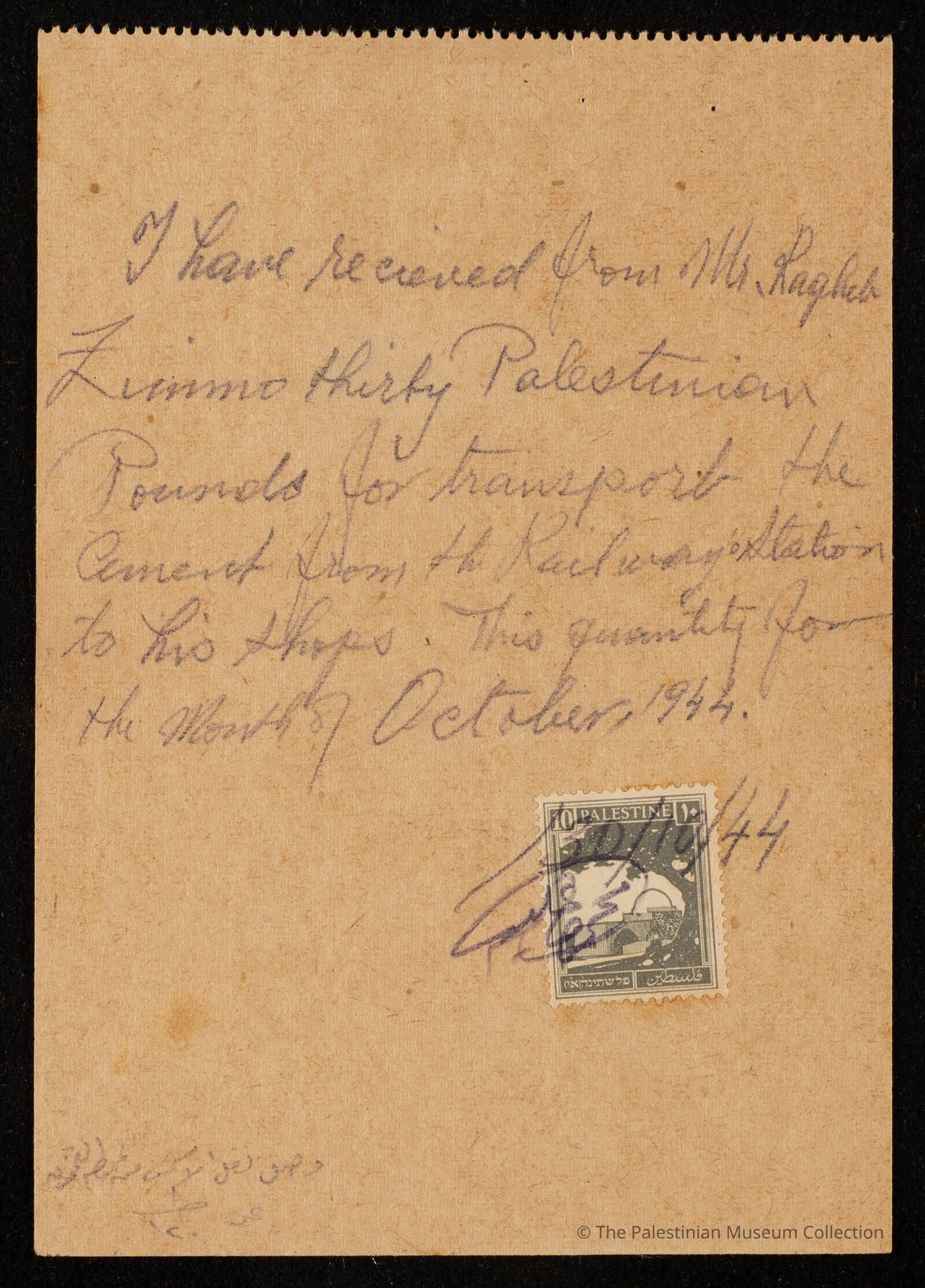 وثيقة وصل تتعلق بنقل الإسمنت من محطة السكة الحديد، وقد كُتبت باللغة الانجليزية.