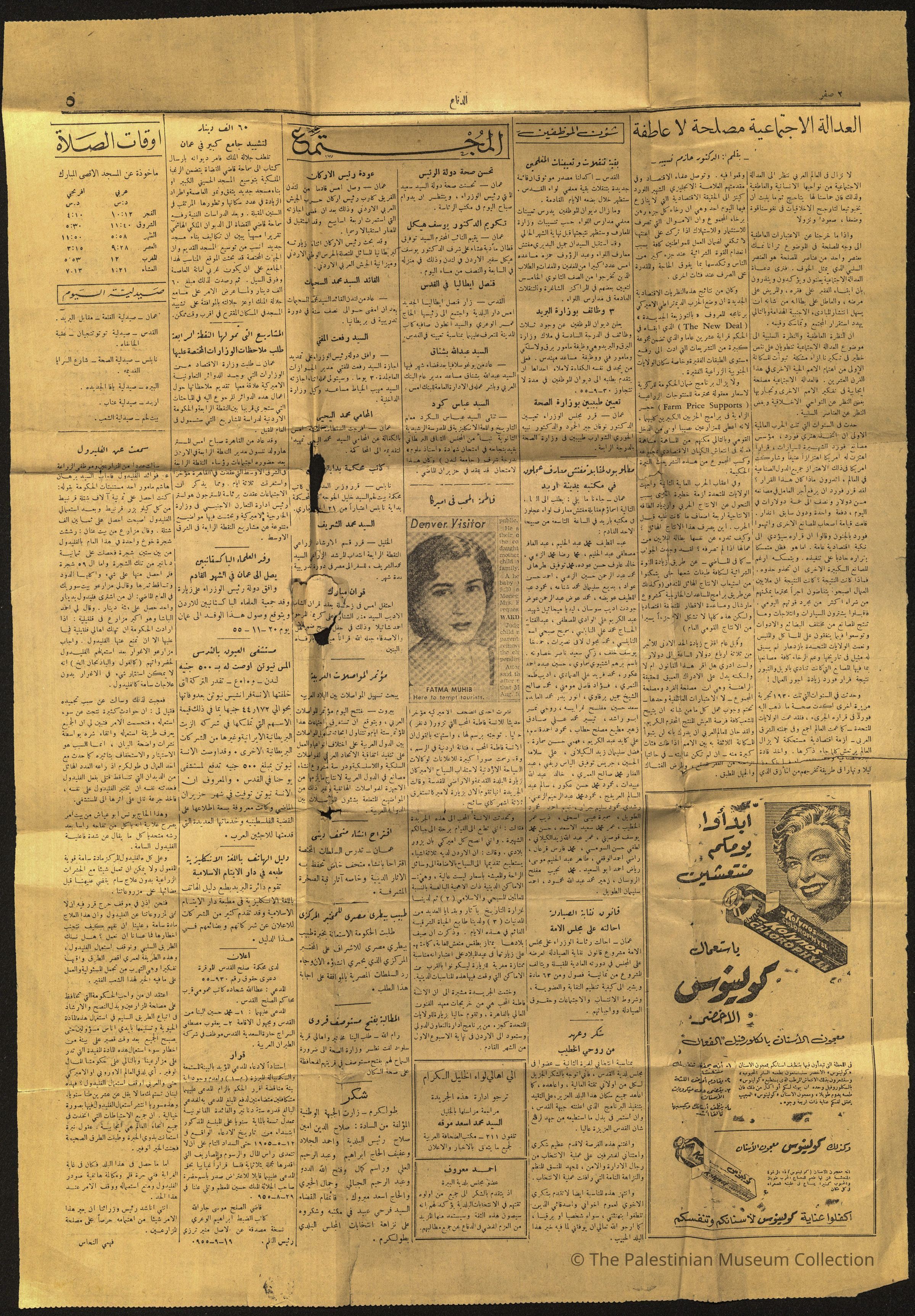 خبر بعنوان "فاطمة المحب في أمريكا" مرفقة بصورة للفنانة في الصفحة الخامسة من جريدة الدفاع، ولا تحمل الصفحة إشارة إلى رقم العدد أو تاريخ صدوره، ويبدو أن هذا العدد صدر في العام 1955، حسب ما ورد في أحد الأخبار الواردة في الصفحة.