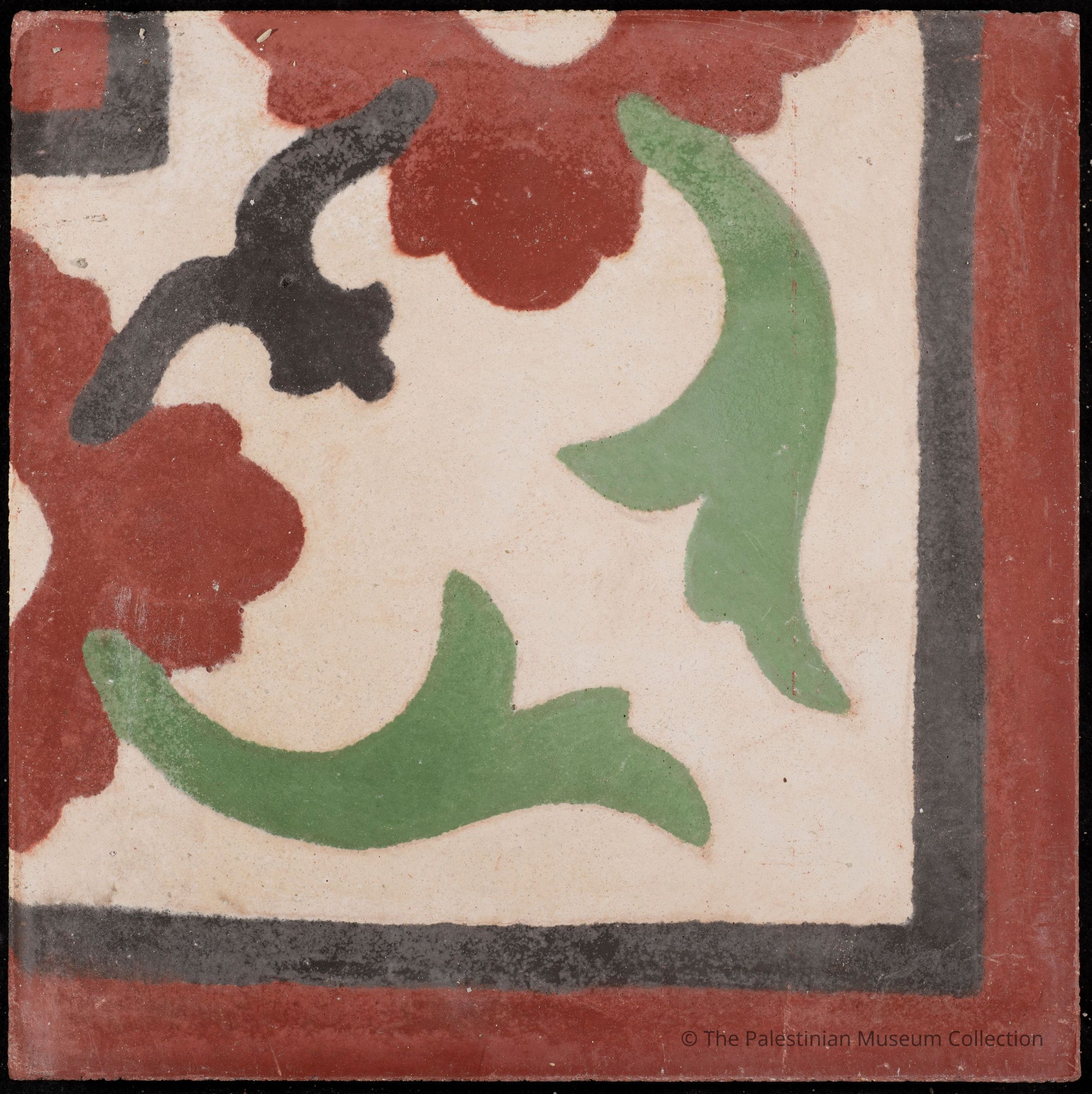 A 20 × 20 cm coloured cement tile featuring the "Corner of the Star Zunnar (Border)" design. This tile is a contemporary reproduction, cast using an original mold from the Aslan Tile Factory in Nablus, which dates back to the 1920s.Made/Created