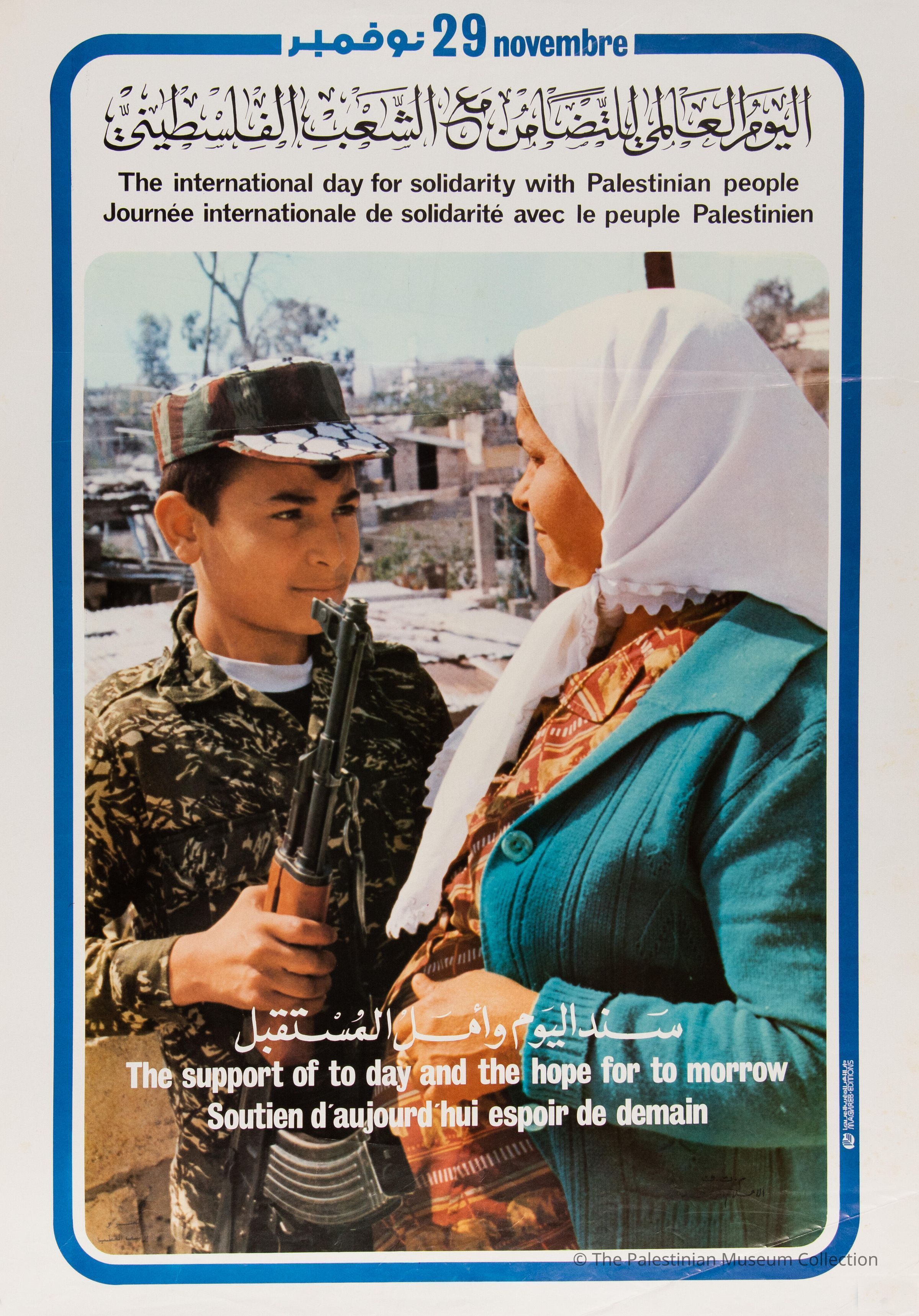 A poster entitled 'The support of today and the hope for tomorrow' issued by the Unified Information Office of the Palestine Liberation Organisation (PLO), year unknown. It commemorates the International Day of Solidarity with the Palestinian People, which is observed every year on November 29th.Dimensions