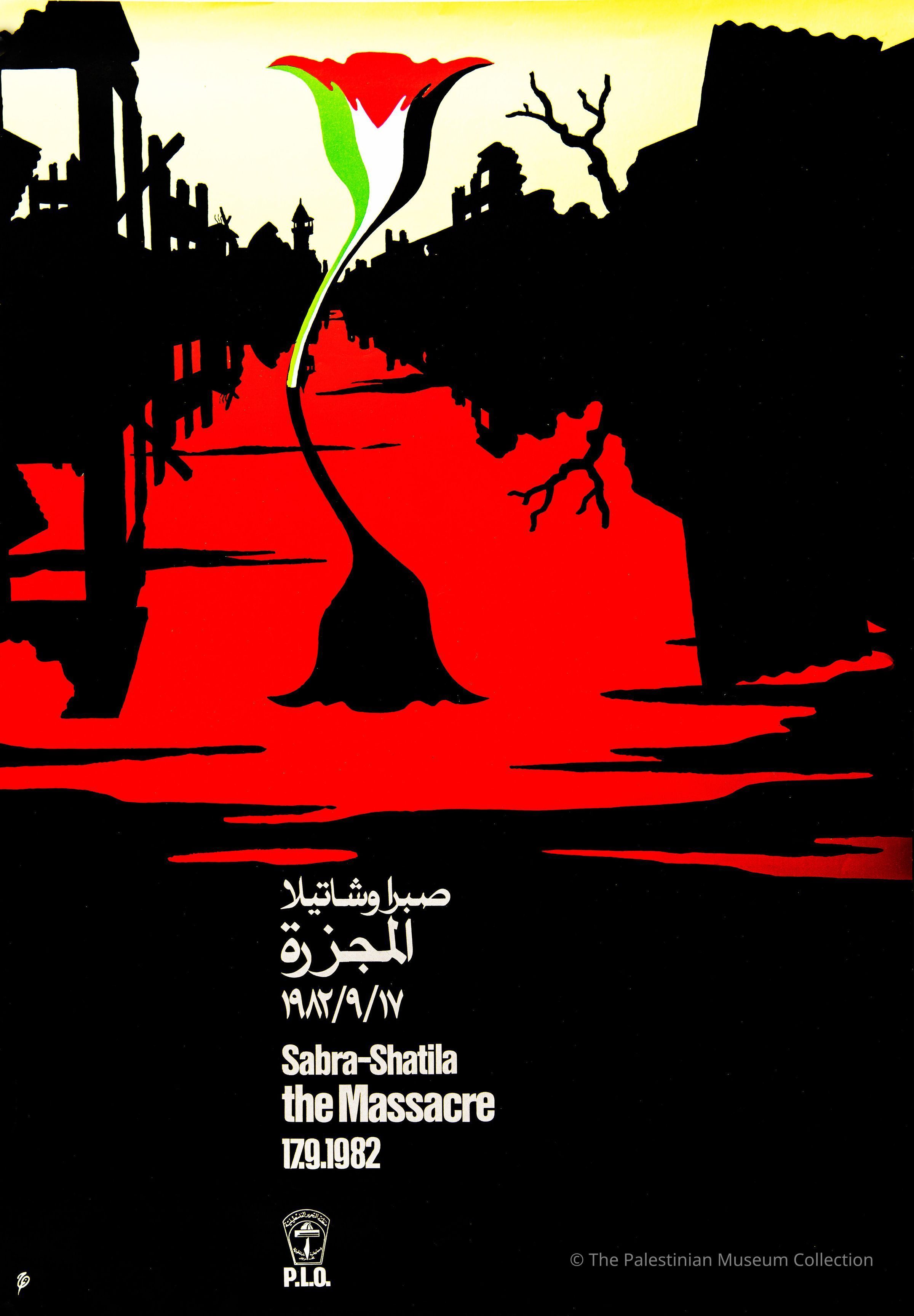 A poster entitled 'Sabra-Shatila the Massacre' issued by the Palestine Liberation Organisation (PLO) in 1982 in the aftermath of the Sabra and Shatila Refugee Camps Massacre. It features a design by the artist Marc Rudin.Dimensions