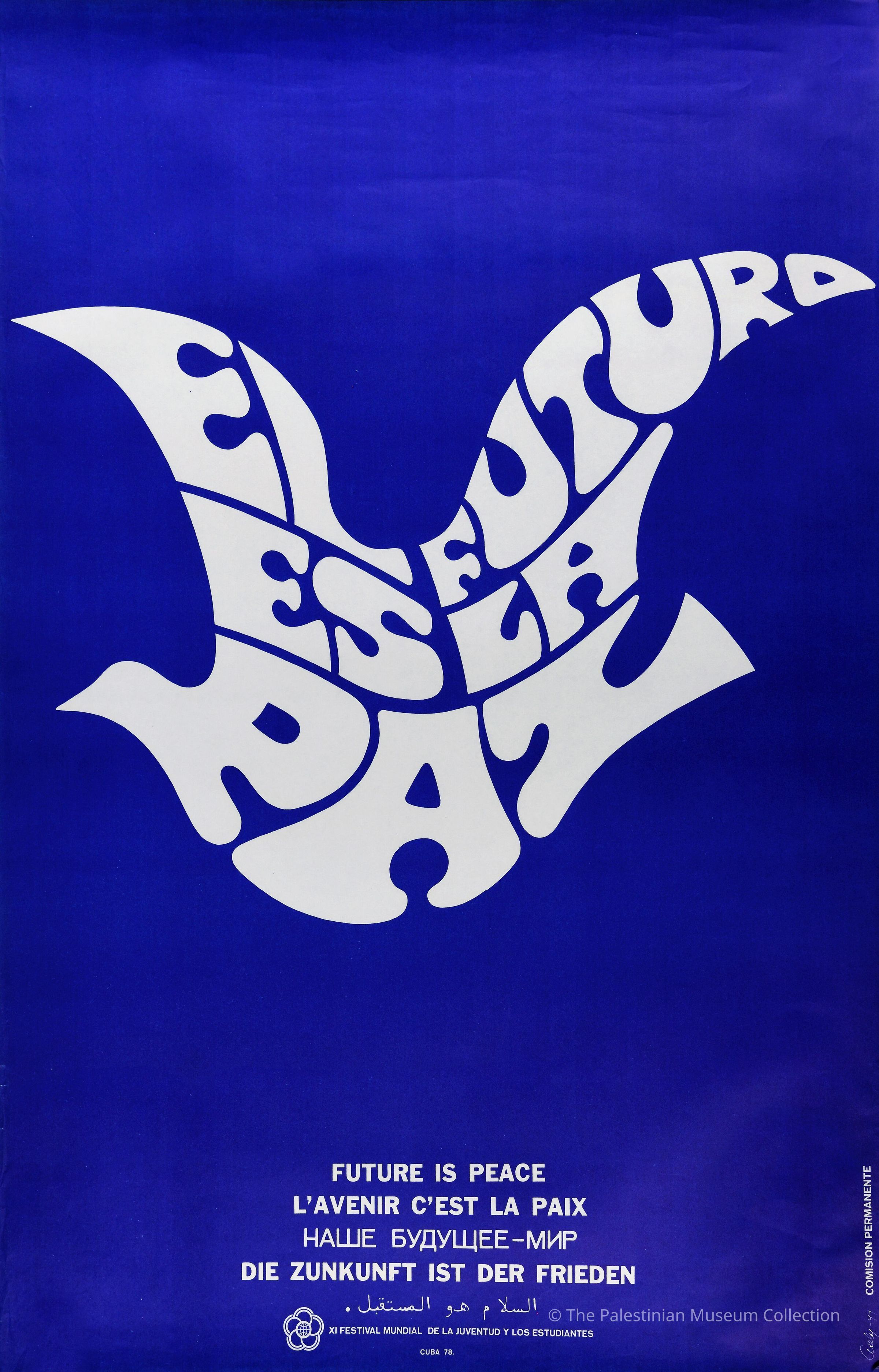 ملصق ملون، يظهر فيه طير مرسوم بكلمات "السلام هو المستقبل" باللغة الإسبانية. A colour poster showing a bird drawn using the Spanish words for "Peace is the Future".