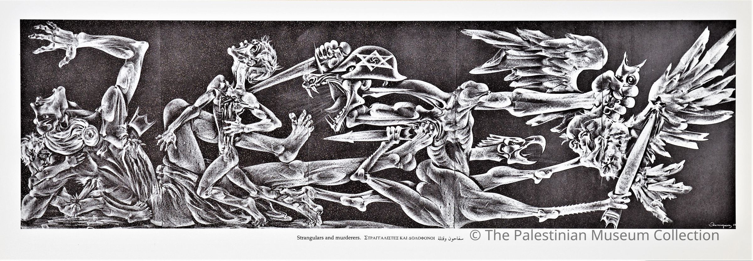 A black-and-white poster showing a painting of predatory animals; wearing helmets with the Star of David on them (representing Israeli), as they kill innocent peopleDimensions
