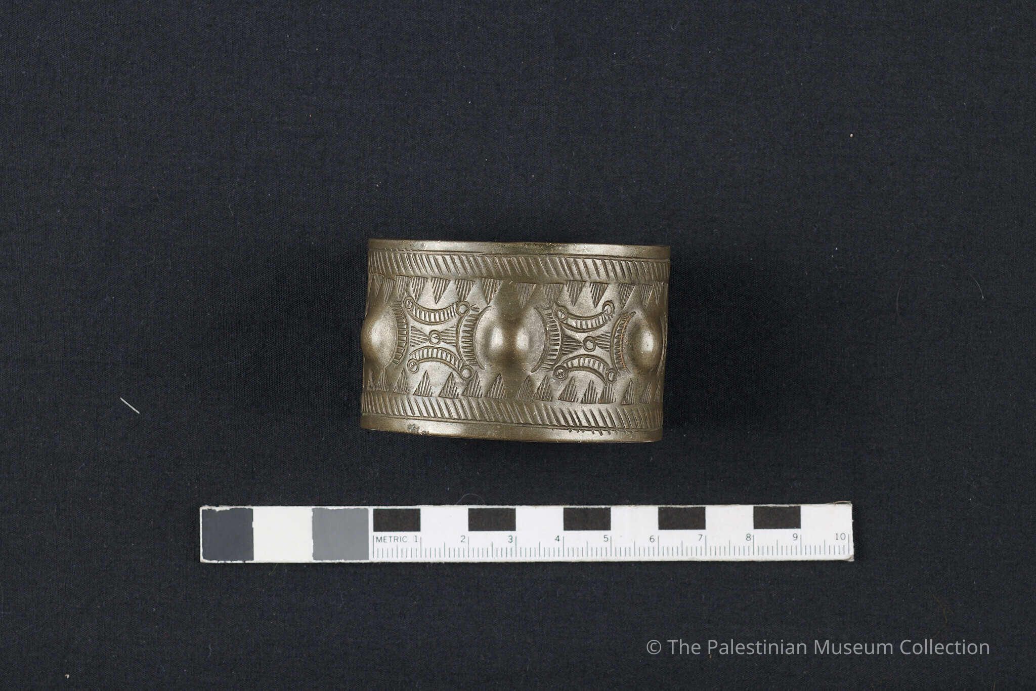 A broad handcrafted silver bracelet from the Hebron region, bearing inscriptions of shapes resembling a turtle, a frog, or a spider. It is clasp-less and has eye-like protrusions. This bracelet was used to indicate that the woman wearing it was breastfeedingMade/Created